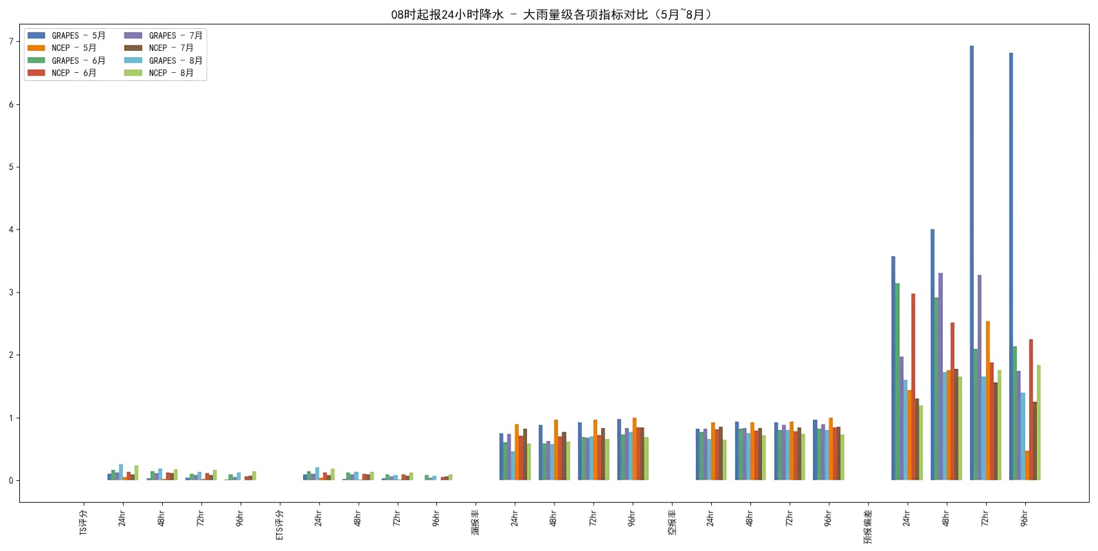 在暴雨量级,两模式的TS评分均较低,反映出暴雨预报的普遍难度。其中7月、8月评分略高于5月、6月,说明主汛期模拟效果相对更好。24小时和48小时时效GRAPES的TS评分多高于NCEP,但随着时效延长,NCEP表现更优。ETS评分也整体很低,且NCEP普遍高于GRAPES。漏报率方面,GRAPES在几乎所有月份均低于NCEP,7~8月差异最为明显。空报率上NCEP整体较低,说明其对暴雨的模拟能力相对更好。预报偏差方面,两模式均呈现不同程度的正偏差,但GRAPES的偏差幅度明显大于NCEP:其在24~96小时时效的偏差均高于2,并于72小时达到峰值,表现出明显的过度预报特征;而NCEP的偏差多维持在1.3~3之间,且随时效变化较为平缓,说明其作为背景场能提供更稳定、偏差相对较小的暴雨量级预报,GRAPES则存在显著系统性偏强的问题。