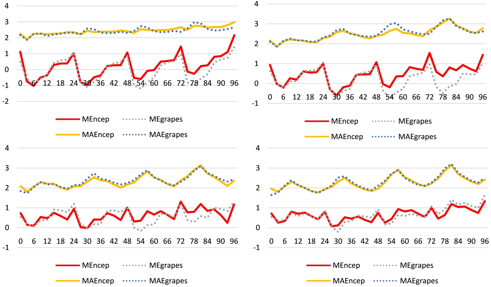 图3展示了两种初始场在08时起报条件下不同预报时效的气温误差与绝对误差。从5月到8月,绝对误差的波动幅度逐月增大,而误差的波动幅度则呈减小趋势。在5月和6月,随着预报时效增加,误差与绝对误差均呈现周期性变化,其中每日14时和08时的预报误差最大。当预报时效在48小时以内时,两种初始场的误差及绝对误差曲线基本重合;超过48小时后,在白天时段(48~60小时及72~84小时),误差为负值,表明预报结果偏低,且在该时段NCEP的误差与绝对误差均优于GRAPES。而在夜间时段(60~72小时及84~96小时),GRAPES的误差小于NCEP,预报更为准确。