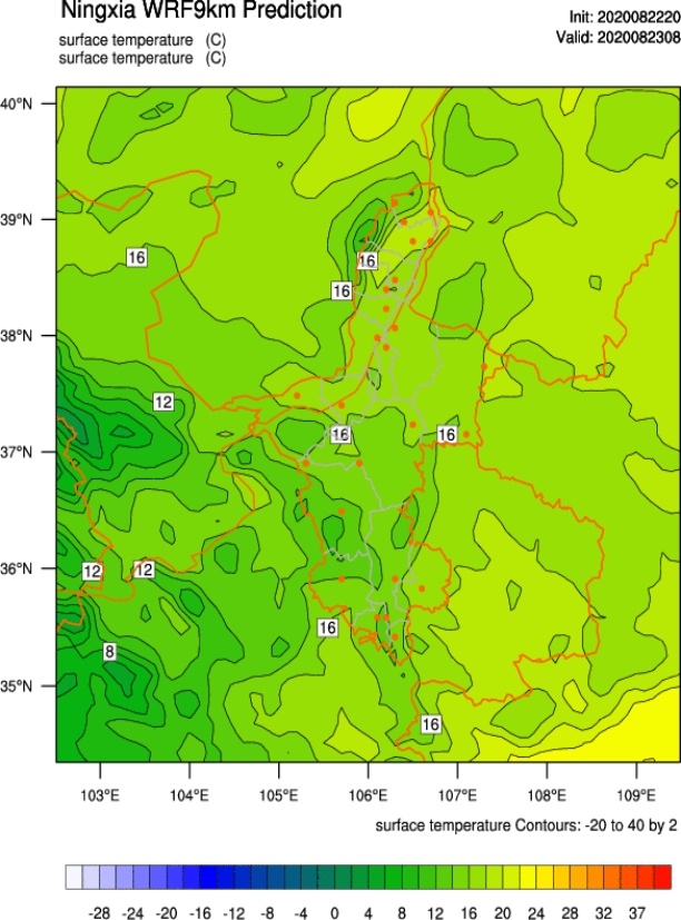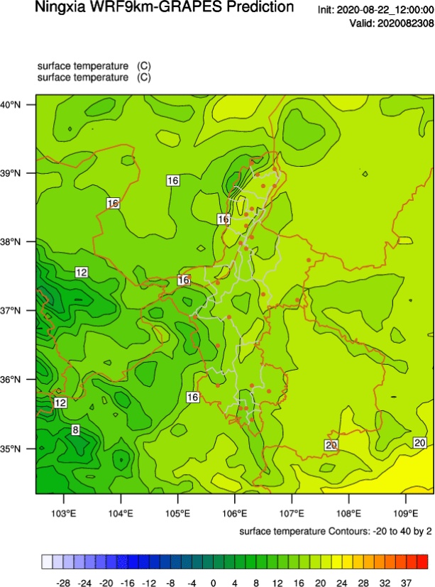 图7为2020年8月23日08时地面温度,可以明显看出有两个低值区分别位于贺兰山沿山以及海原县,温度由西向东逐渐升高。两种初始场的输出结果NCEP优于GRAPES。其中,贺兰山沿山的低温中心二者都能较好模拟,范围及强度均与实况差别不大;南部山区的低温中心范围较大,从中部沙坡头延伸到海原西吉一带,对此NCEP能够较好模拟出山区低值中心。