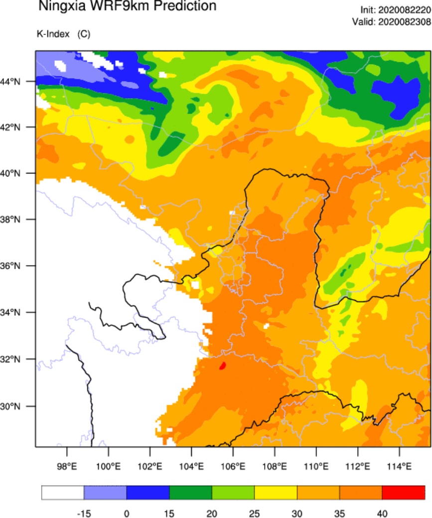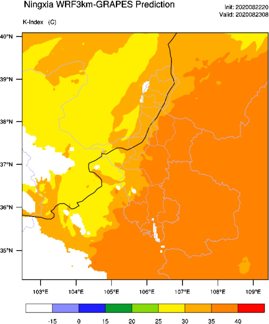 图9为2020年8月23日08时K指数,可以看到宁夏东南部K指数较大,最大超过35,往西北部逐渐减小,灵武、盐池、同心、西吉、原州区、彭阳、隆德等地K指数均大于35。而降水中心位于南部山区尤其是同心县及泾源县,K指数较小,与实况站点资料不符。NCEP相较GRAPES模拟出大值区的范围较小,位置偏东南,与降水实况相比,GRAPES模拟结果更优。