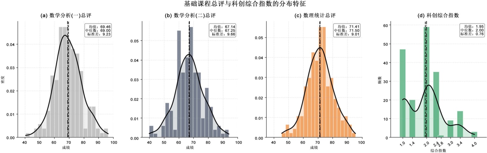 为了深入了解基础课程学习与科研能力的关系,对已有成绩进行描述性统计分析,结果如图2所示,展示了三门基础课程总评成绩及科创综合指数的分布特征。从图2(a)~(c)可以看出,数学分析(一)、数学分析(二)和数理统计的总评成绩均值分别为69.46分、67.14分和71.41分,均呈现近似正态分布,但数学分析(二)略呈左偏,低分现象明显,表明该课程难度较高,或学生掌握程度存在显著差异。数理统计成绩分布最为集中(标准差为9.01),显示学生整体掌握较为均衡。