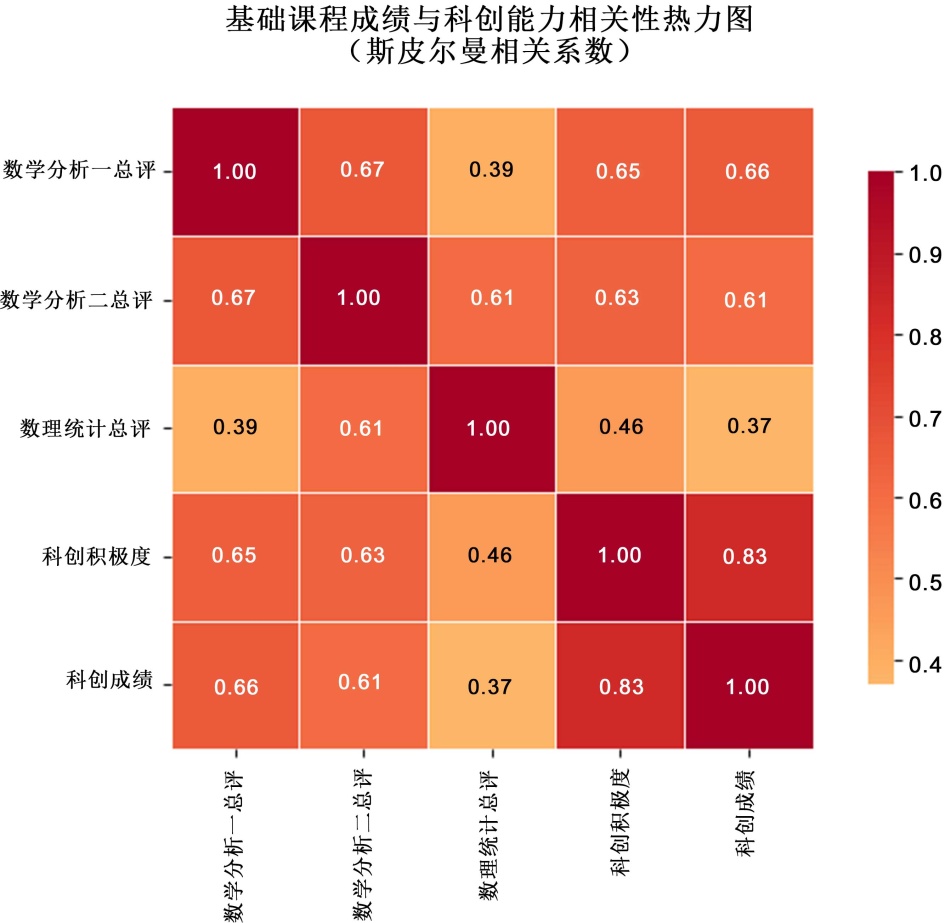 为探究基础课程学习成效与科创能力之间的内在关联,本研究采用斯皮尔曼等级相关系数分析各变量间的相关关系,结果如图4所示。