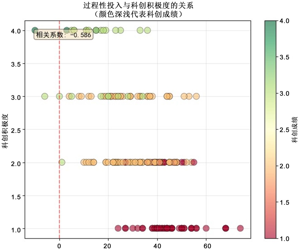 第二,过程性投入存在双重效应,真实学业能力才是影响科创表现的关键。过程性投入度与科创积极度呈显著负相关(r = −0.586, p < 0.01)。高投入度群体表现出心有余而力不足的特征,学习态度端正但应用能力薄弱,科创参与积极性高但产出质量低;低投入度群体则属于能力驱动型,他们真实学业能力扎实,能够独立完成科研任务。这一发现警示我们要避免“过程性评价陷阱”,即不能仅凭平时作业积极等表层行为判断学生科创潜质。