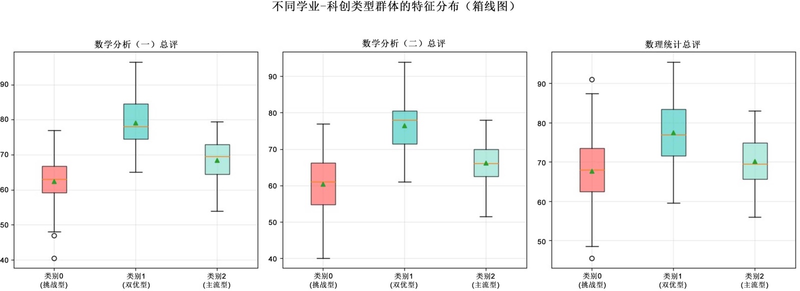 三类群体的识别揭示了统计与数学学院学生学业–科创能力发展的三种典型路径,呈现出较为均衡的“橄榄型”分布。其中,学业基础与科创能力呈现显著的正向关联:双优型群体在数学分析(一)与科创积极度上均表现卓越,而适应挑战型则双双落后,主流适应型处于中间状态。