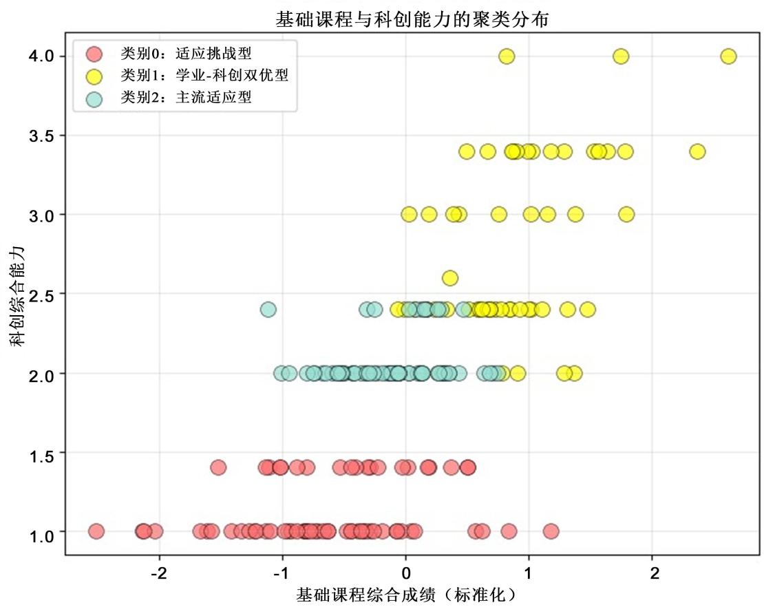 第三,学生群体呈现学业与科创能力的显著不同,需实施精准识别与分层支持。聚类分析识别出三类典型群体:适应挑战型、主流适应型与学业与科创双优型。接近40%的学生面临着学业基础薄弱与科创参与不足的困境,而拔尖创新人才的学业与科创能力形成了正向循环。这一分布提示当前培养模式在促进学业适应与科研启蒙方面存在较大改进空间。