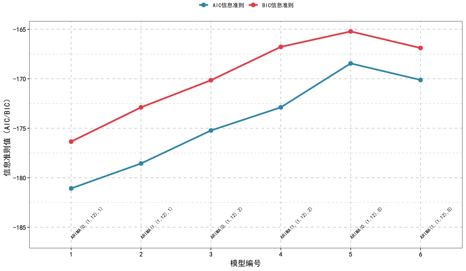 上图显示不同模型的AIC、BIC值存在明显差异:模型1 [ARIMA(0,(1,12),1)]的AIC值显著低于其他模型,同时BIC值也处于较低水平;其余模型(如模型2 [ARIMA(0,(1,12),1)]、模型3 [ARIMA(0,(1,12),1)]等)的AIC/BIC值均高于模型1。