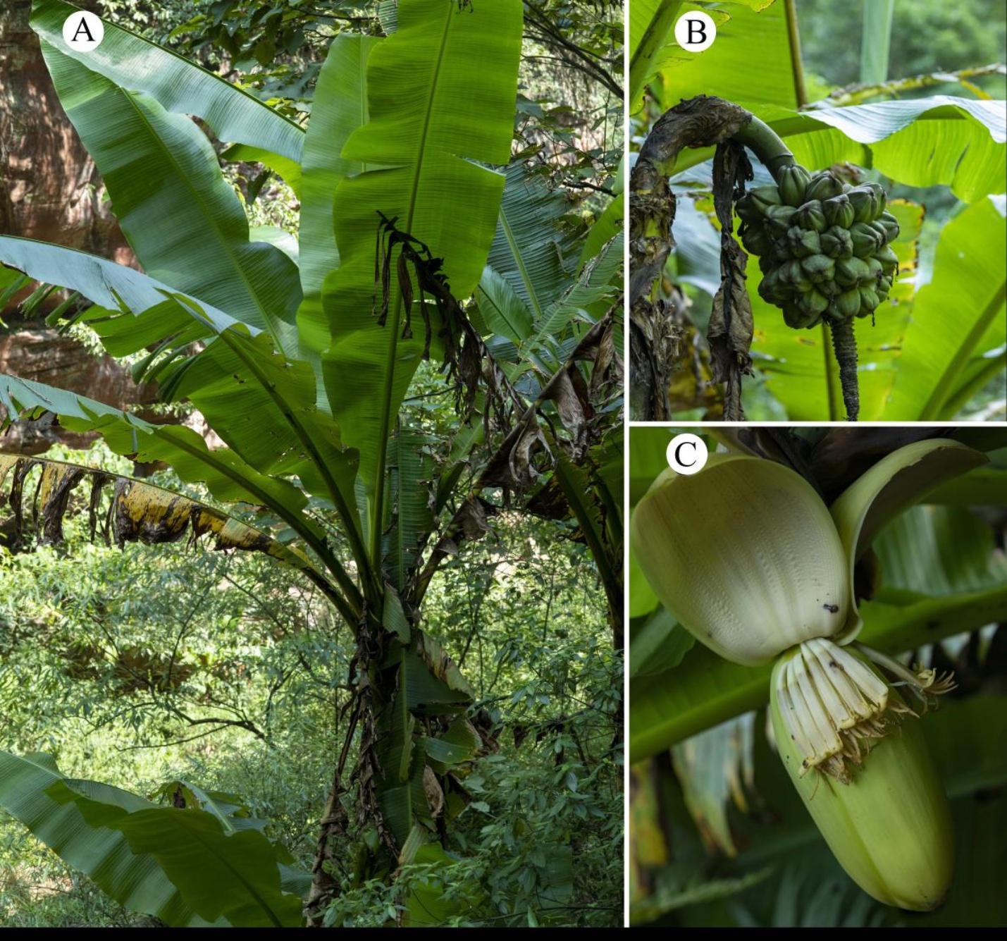 图1. 黄苞芭蕉A:植株和生境;B:果实;C:苞片和花序