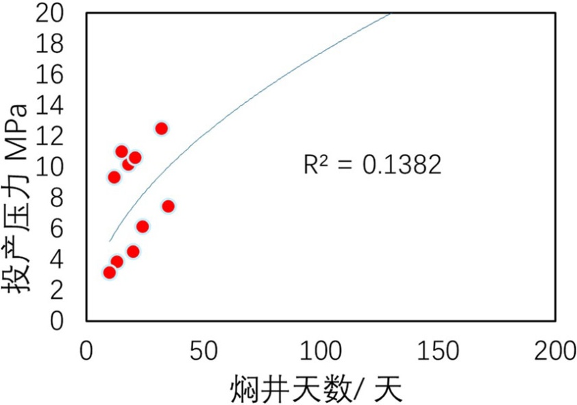 与投产压力的关系,R2 = 0.71,呈显著正相关(见图4)。交会图中嵌入局部图为理论投产压力和理论压降示意图。理论差值越大,投产压力越高,说明实际焖井不足导致压力恢复不充分。例如HYBHF实际焖井15天、理论45天,差值30天,投产压力16.02 MPa;HYEHF实际8天、理论约35天,差值27天,投产压力23.15 MPa (全区最高)。