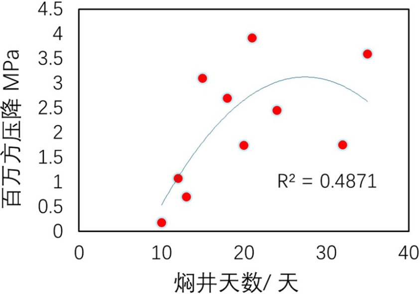 建立实际焖井天数与投产压力与百万方压降交会图,焖井时间均表现出二项式曲线先增加后减小峰值特征,如图3所示。