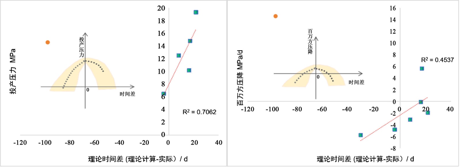 图4. 焖井时长理论时间差与投产压力、百万方压降相关性图
