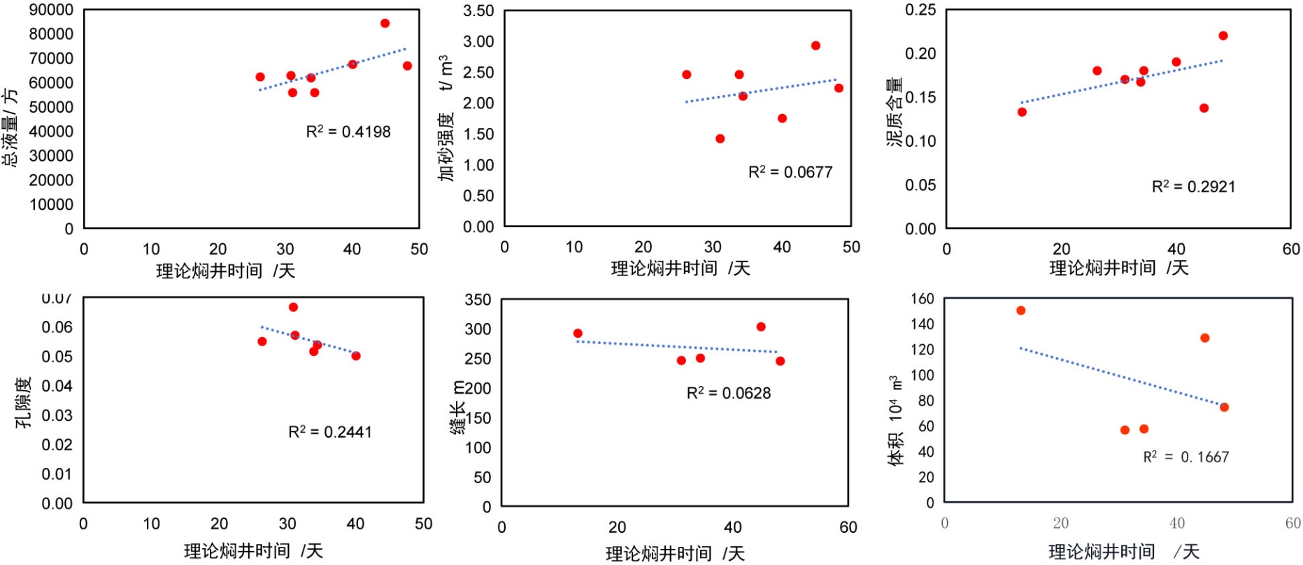 开展焖井时间与地质工程参数的相关性分析(图5):压裂液量:R2 = 0.42,正相关性最强,液量每增加1万方,焖井时间延长约3.5天;泥质含量:R2 = 0.29,正相关,泥质含量高的层段自吸速度慢,需要更长时间;孔隙度:R2 = 0.24,负相关,孔隙度大的储层连通性好,压力平衡快;渗透率:呈复杂非线性关系,极低渗透率(<0.01 mD)时基质吸液能力弱,焖井时间反而缩短。