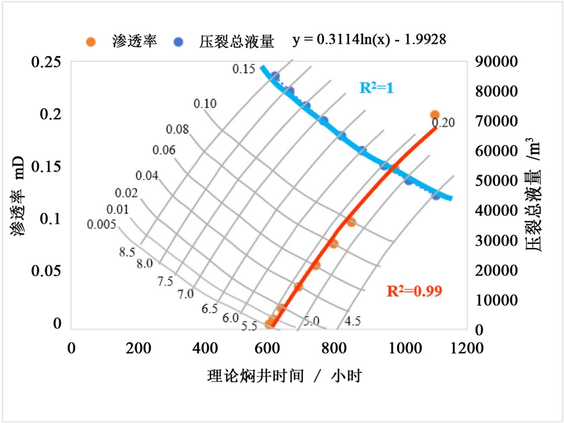 Figure 7. Permeability-fracturing fluid volume-well soaking time calculation chart