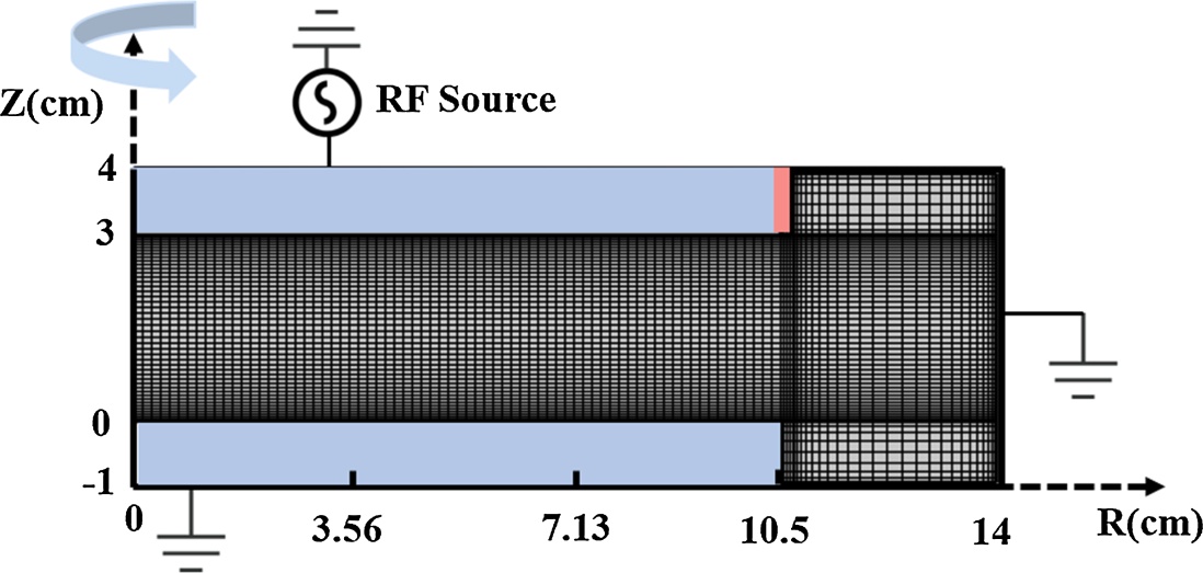 本研究采用仿真软件对容性耦合O2等离子体放电过程建立二维流体模型。如图1所示,模型腔室材质为不锈钢,半径为14 cm,上下电极的半径均为10.5 cm,厚度为1 cm,两电极间距离为3 cm。上电极连接一个射频电压源,下电极和侧壁接地。为了避免电源电极与接地侧壁之间的放电,使用0.2 mm厚的电介质环包裹电源电极,相对介电常数设定为8.5。计算中,放电区域采用结构化网格进行剖分,并在鞘层处设置了加密的网格层。