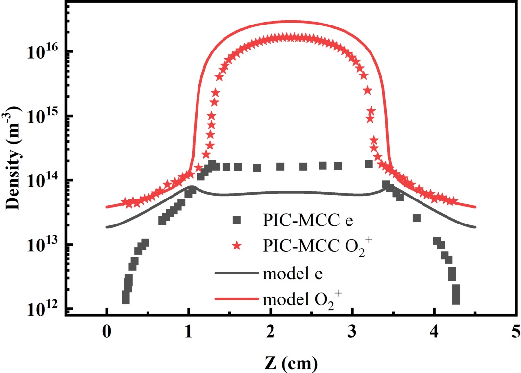 密度轴向分布:本文模型结果(实线)与文献[5]中PIC-MCC模拟数据(符号线)的对比放电参数:13.56 MHz、222 V,0.05 Torr、极板间距4.5 cm