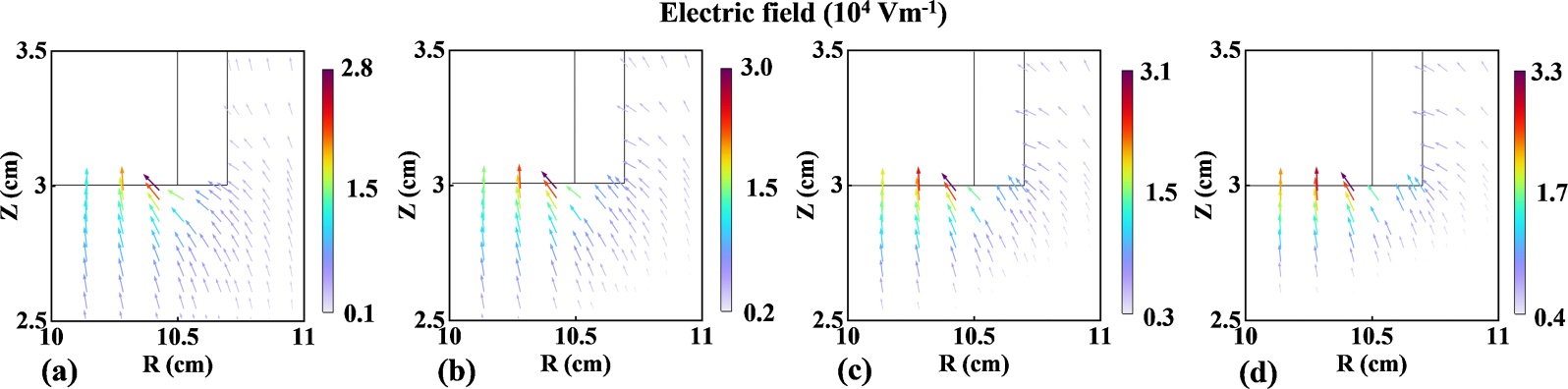 Figure 4. Spatial distributions of electric field around upper electrode edge at different frequencies: (a) 13.56 MHz, (b) 27.12 MHz, (c) 40.68 MHz, (d) 60 MHz