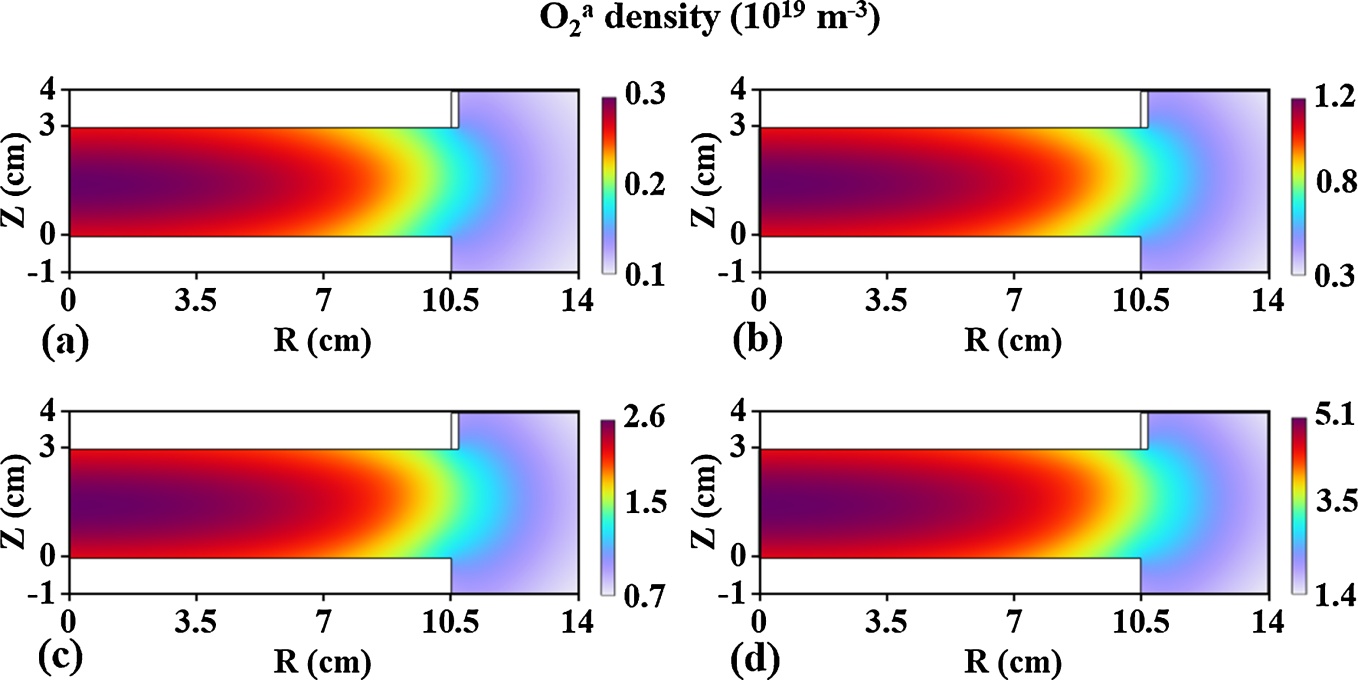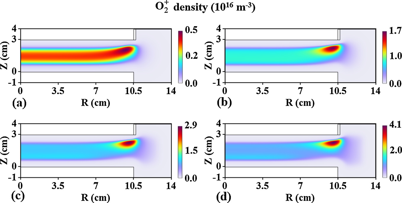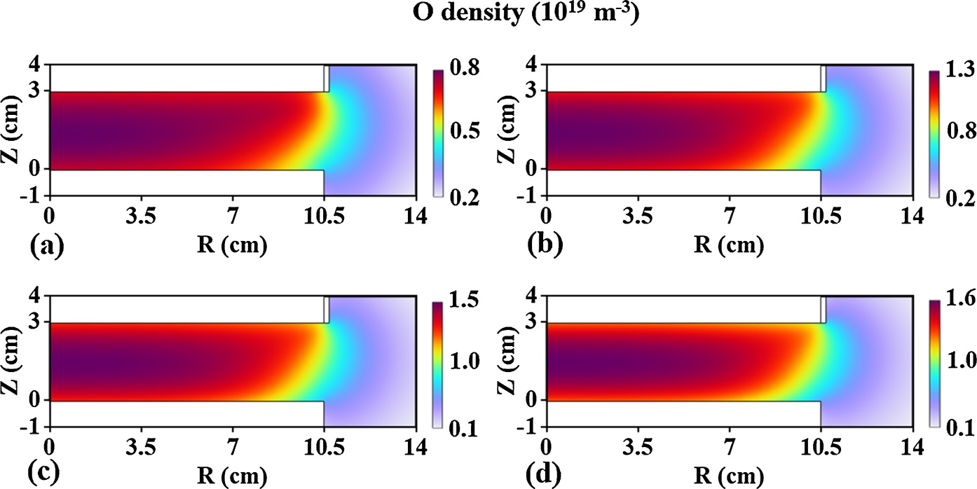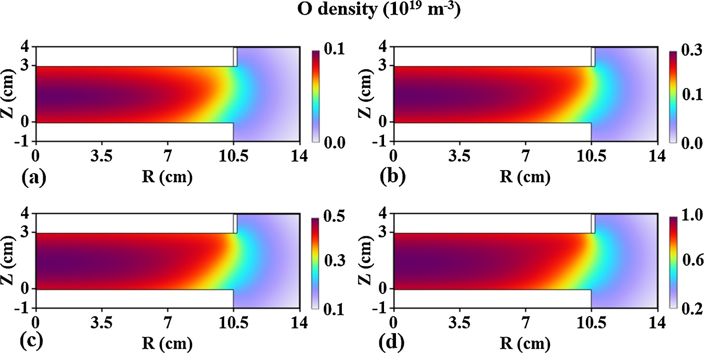 图12. 不同气压下的O密度空间分布:(a) 0.25 Torr,(b) 0.5 Torr,(c) 0.75 Torr,(d) 1 Torr