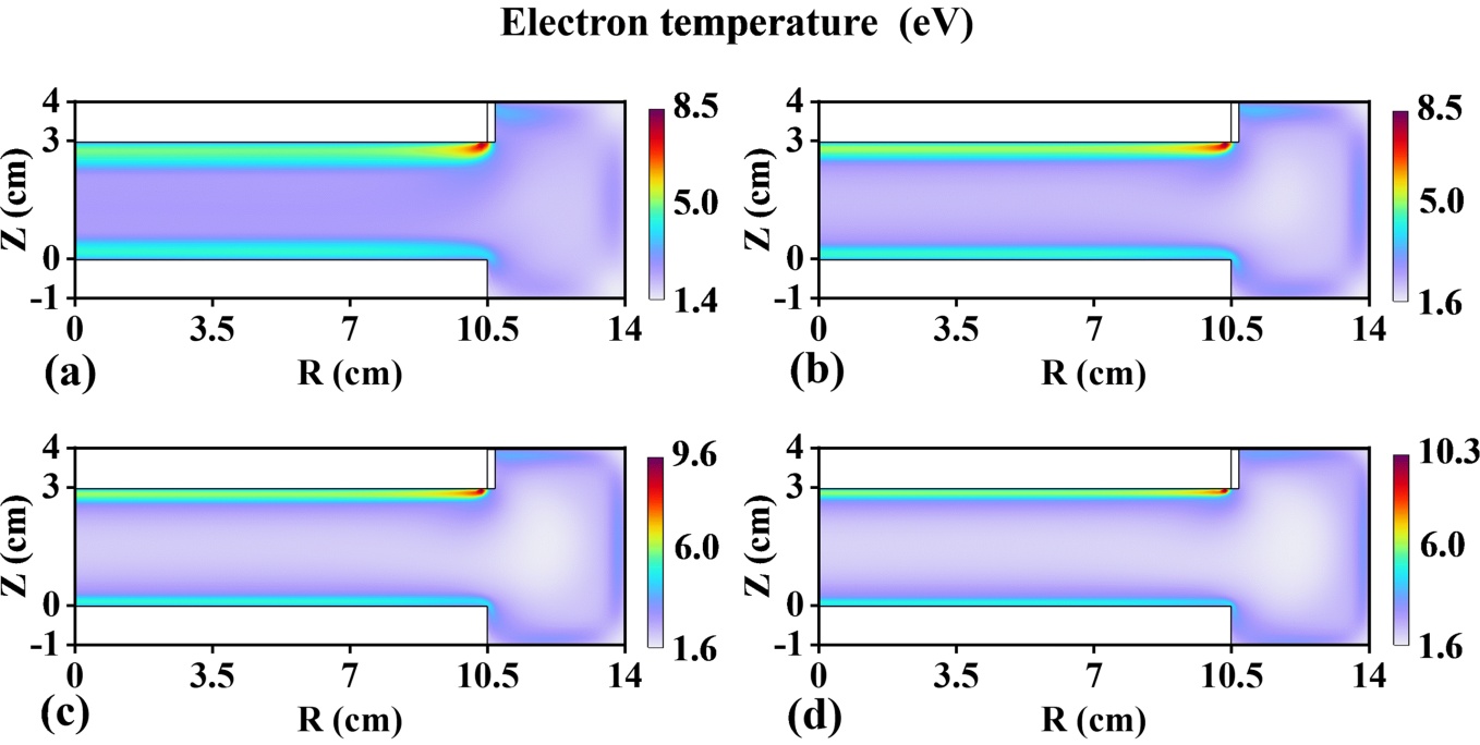 Figure 6. Spatial distributions of electron temperature at different frequencies: (a) 13.56 MHz, (b) 27.12 MHz, (c) 40.68 MHz, (d) 60 MHz
