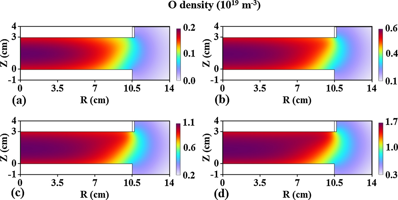 Figure 12. Spatial distributions of O density at different pressures: (a) 0.25 Torr, (b) 0.5 Torr, (c) 0.75 Torr, (d) 1 Torr