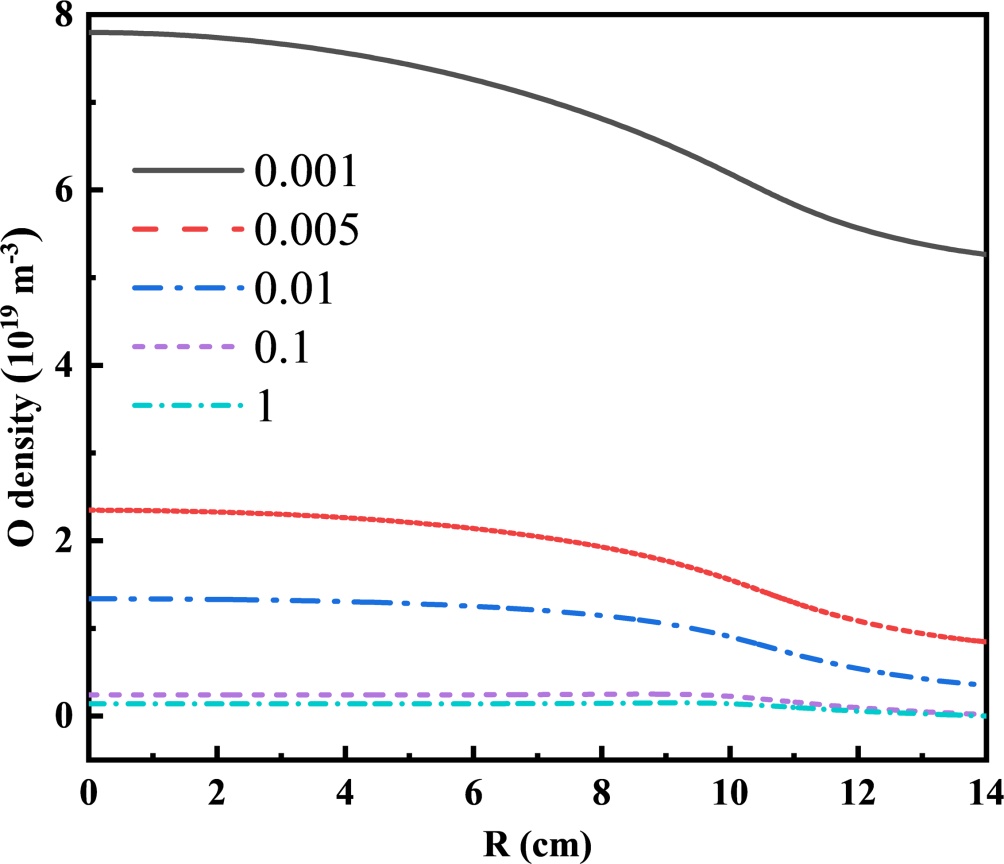 图13. 不同O原子表面黏附系数下腔室中心处O原子密度的径向分布
