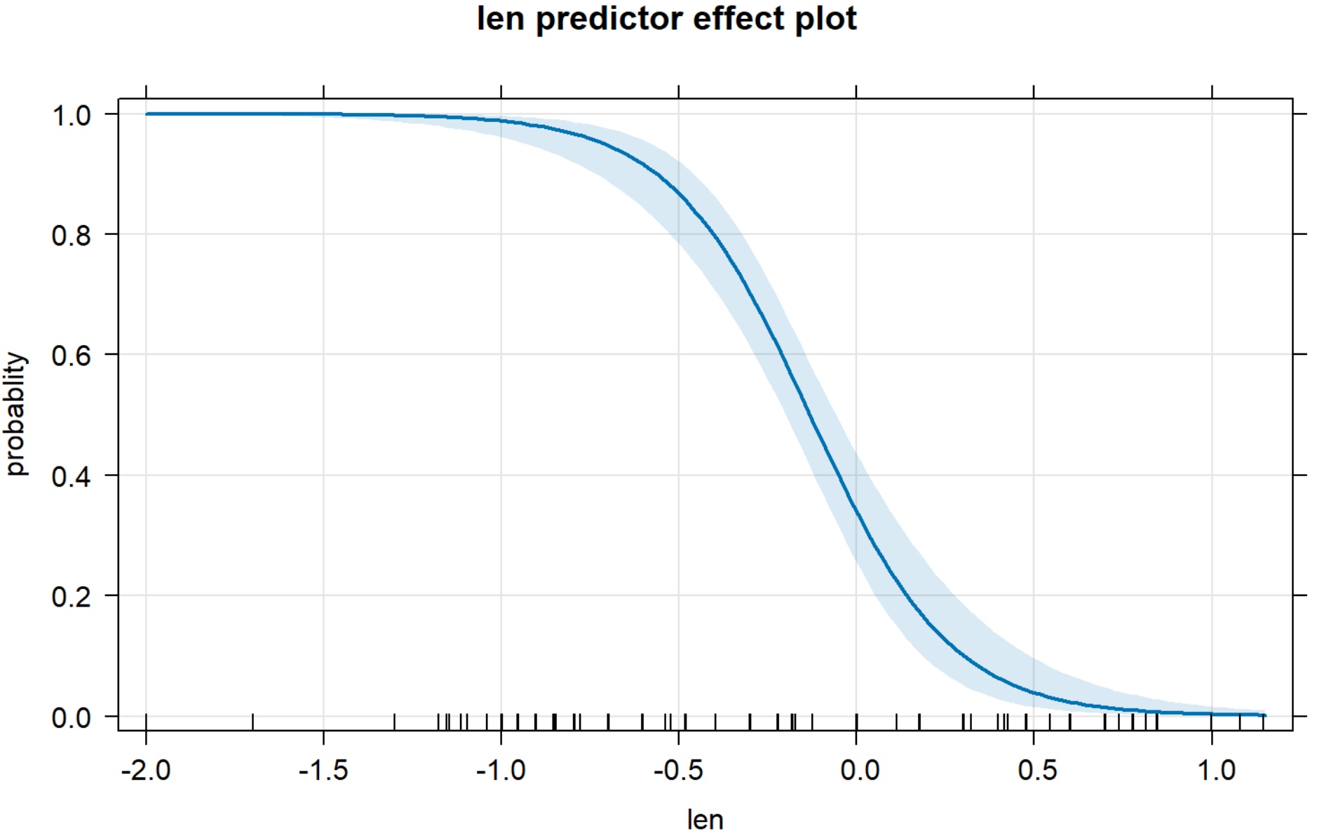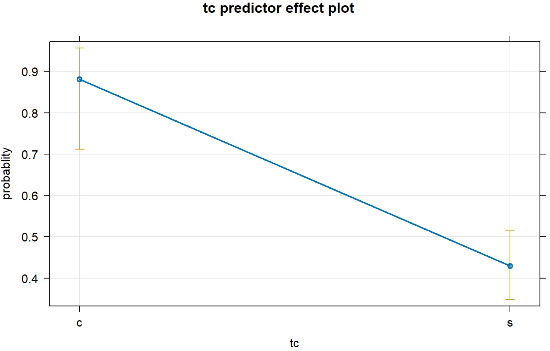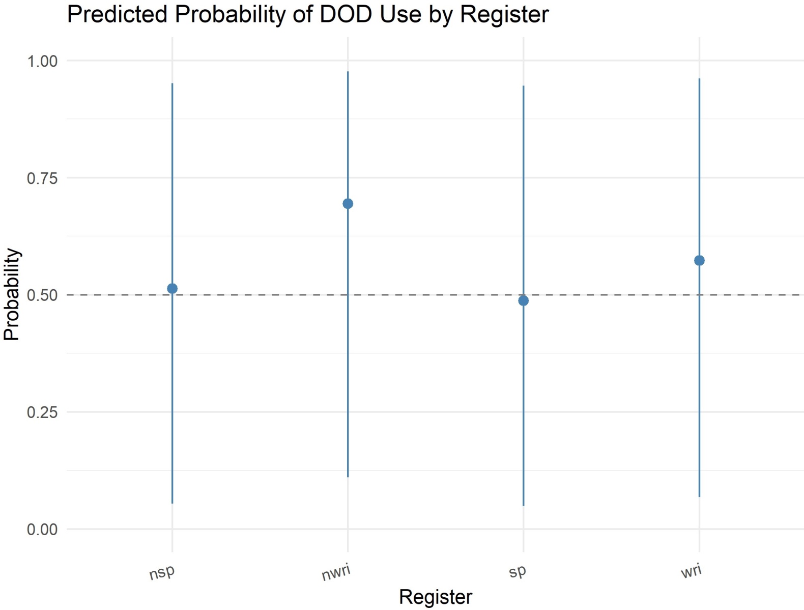 本研究在R软件中使用逻辑回归模型,以双宾构式的选择(1 = 双宾构式,0 = 介宾构式)为二分类因变量,探究各预测变量对构式选择的影响。模型中语域作为固定效应纳入分析,语域包含四个水平:口语非正式(nsp)、书面非正式(nwri)、口语正式(sp)、书面正式(wri);其余预测变量同步纳入固定效应,包括受事有生性、主题定指性、受事代词性、主题复杂性、动词含义及受事–主题长度比。对所有分类固定效应采用和对比编码(sum coding)进行参数化,实现各语域水平间的两两对比并得到标准化系数估计;连续变量受事–主题长度比经对数化处理后纳入模型,以消除量纲影响并提升模型拟合度。