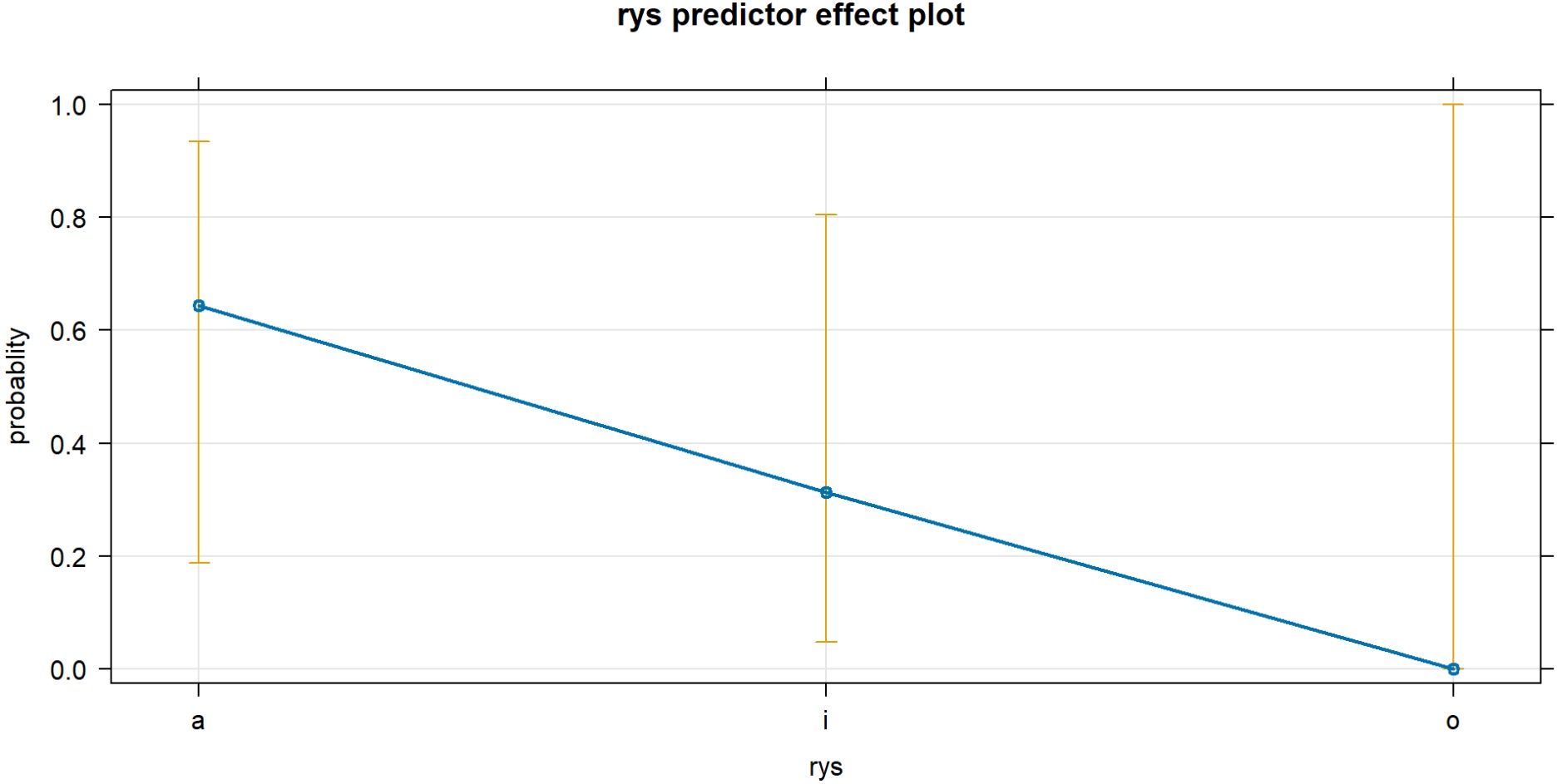本文在R中使用逻辑回归模型,以双宾构式选择为因变量,将语域、受事有生性等变量设为固定效应,对分类变量采用和对比编码(sum coding)分析,连续变量长度比经对数化处理后纳入模型。初始模型包含所有预测变量,经AIC向后剔除法逐步剔除非显著效应,最终得到最优拟合模型,模型预测准确率达到89.8%,模型C值达到96.3%,可见模型对数据的拟合程度较好。最终模型中,仅受事有生性、主题定指性、受事代词性、受事–主题长度比、主题复杂性和动词含义对双宾构式的选择有显著影响,结果如表1所示。Wri (书面正式)为对比和编码基准水平;结果由glm拟合逻辑回归模型计算所得语域对构式选择具有显著影响(p < 0.05),其中书面非正式语域(p = 0.0154 < 0.05)的正向影响达到统计显著水平,表明其相比平均语域更倾向于使用双宾构式。而口语正式语域虽趋势相反,但未达显著水平。此外,受事–主题长度比、受事有生性等变量也显著影响构式选择。从图1的边际效应,即双宾构式使用预测概率来看,书面非正式语域选择双宾构式的预测概率最高,其次为书面正式语域,口语正式和口语非正式的预测概率接近0。这一结果直接验证了书面语相较于口语更倾向使用双宾构式,且非正式书面语的双宾构式选择偏好最为显著的核心结论,与研究假设一致。