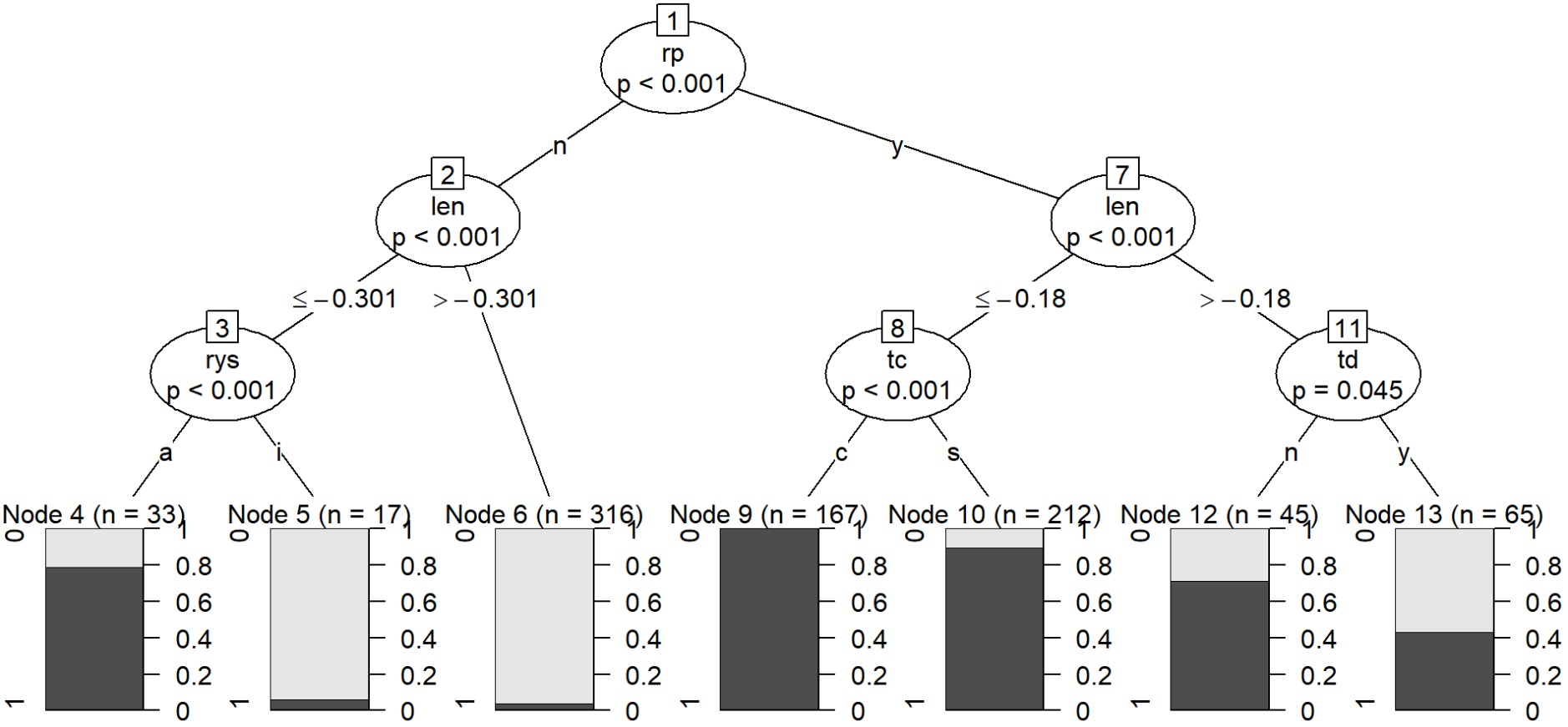 随后,我们针对划分的变量进行了决策树分析,结果如图8所示。受事代词性是最重要的变量,其次是受事主题长度比、受事有生性、主题复杂性和主题定指性。这些变量都在上文的逻辑斯蒂模型中