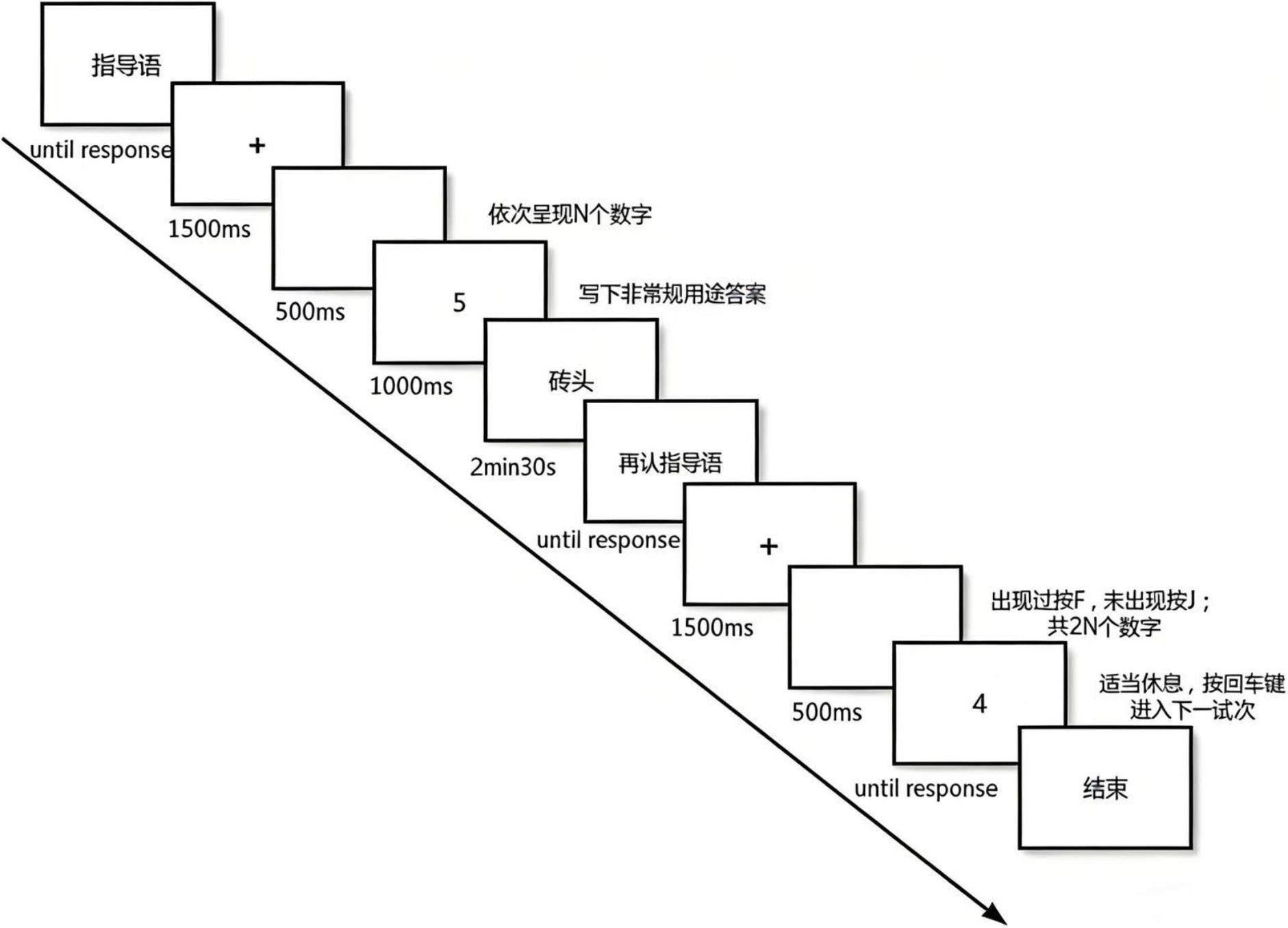 次级任务是控制记忆负荷的具体操作任务。由计算机在一系列固定时间间隔上同一位置随机依次呈现n个1~9的阿拉伯数字。依次呈现的数字数量越大,对参与者而言任务负荷程度就越大。下面以高负荷情景举例:参与者需要同时进行数字再认和AUT任务;首先屏幕中央同一位置会随机依次呈现n个数字,数字从1到9,参与者需要记忆数字;所有数字呈现完之后,呈现AUT刺激词语,参与者在纸上写下所想到的非常规用途,限定时间为2分钟30秒,随后要求对数字进行再认(正确按F键,错误按J键),再认完成后按回车键进入下一试次,每一个负荷水平有2组试次,实验除练习试次外共计6个试次。