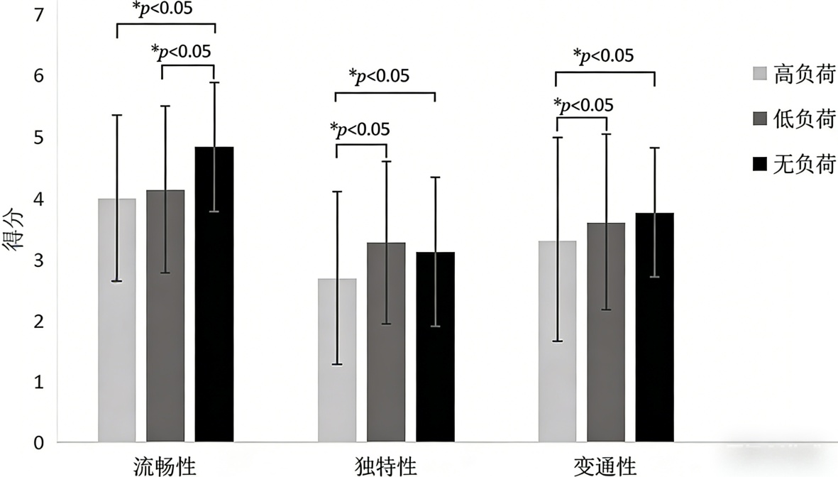 Figure 3. Comparison of scores on three dimensions of creative thinking under three load conditions