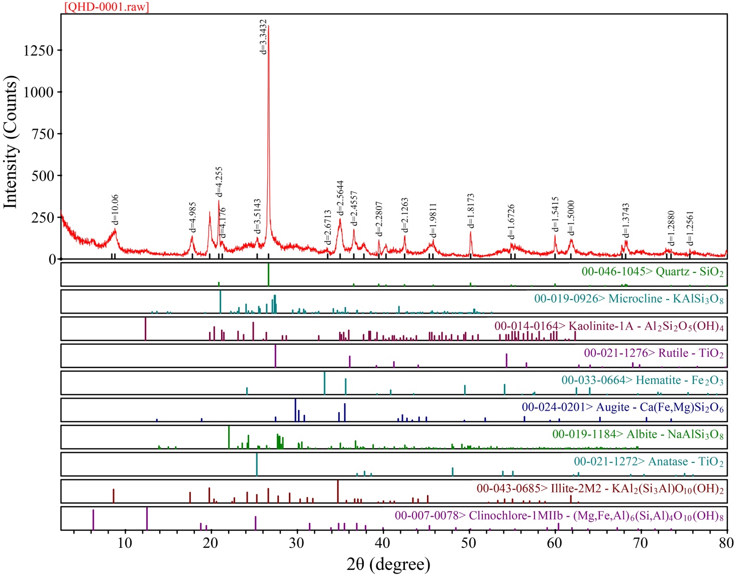 研究唐山地区本溪组含铝岩系的矿物学特征利用X射线衍射实验测得其矿物学特征,实验在河北工程大学实验室内完成,利用不同矿物具有不同的衍射峰的特点,本文利用衍射图与PDF卡片库中的标准衍射图谱进行对比,进一步进行验证,从而检索样品中所包含的矿物。