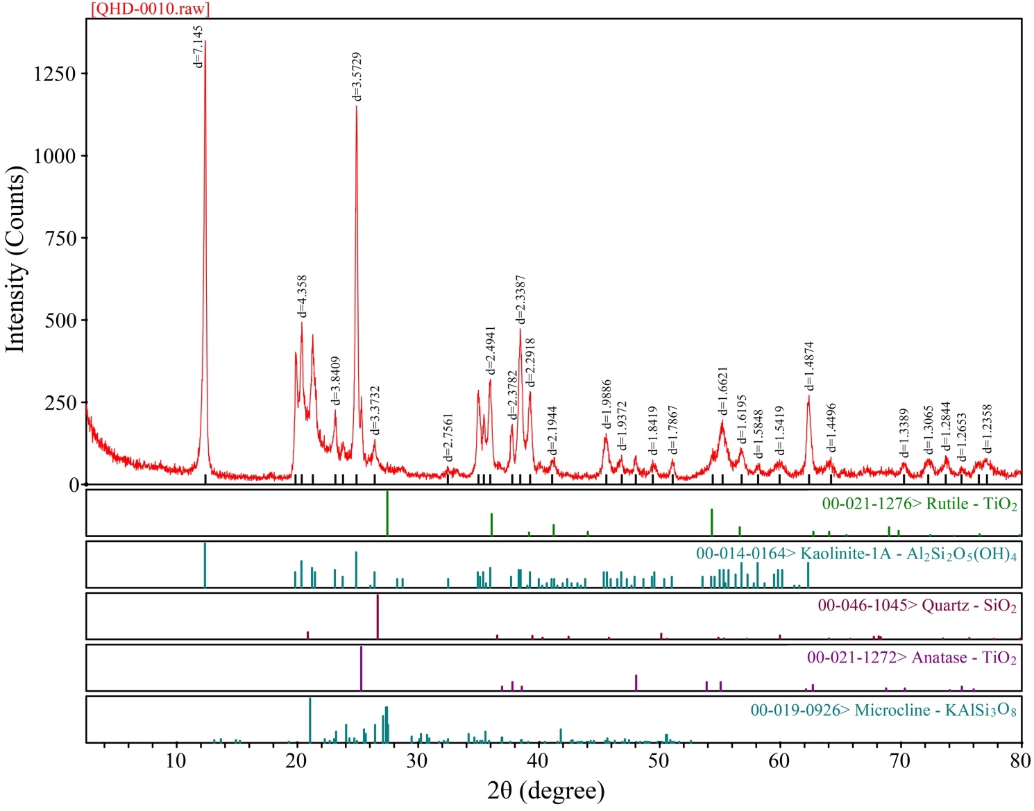 根据(图1(b))晶面间距d = 7.145、d = 4.471、d = 4.358、d = 3.357、d = 3.738、d = 2.338、d = 1.667和d = 1.487等处的衍射峰与高岭石(Al2Si2O5(OH)4)的标准图谱文件PDF#00-014-0164相对应。晶面间距d = 3.51和d = 2.38处的衍射峰与金红石(TiO2)的标准图谱文件PDF#00-021-1276相对应。晶面间距d = 2.49、d = 2.19和d = 1.686处的衍射峰与属于锐钛矿(TiO2)的标准图谱文件PDF#00-021-1272相对应。晶面间距d = 4.378、d = 4.172等处的衍射峰与属于钾长石(KAlSi3O8)标准图谱文件是PDF#00-019-0926相对应。可知(下图b)的矿物组成为高岭石、钾长石、锐钛矿和金红石。根据峰的强弱可知样品b的主要矿物组成为其主峰与次峰均为高岭石,另存在少量的金红石与锐钛矿,以及部分石英。