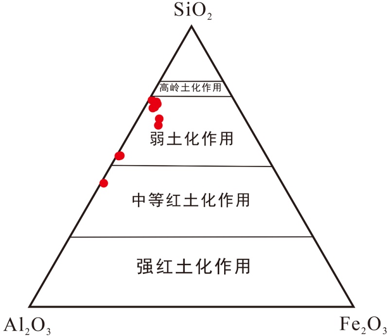 本研究对赵各庄铝土矿区铝质黏土矿研究分析,见表1可以发现常量元素氧化物以Al2O3、SiO2、Fe2O3、K2O、TiO2元素为主。其中Al2O3的含量21.38%~48.76%,均值为28.45%、SiO2的含量39.03%~65.77%,均值为56.56%、Fe2O3的含量0.796%~6.58%,均值为2.58%、K2O的含量0.17%~3.66%,均值为1.65%。TiO2的含量0.69%~2.68%,均值为1.38%.并且含有少量的CaO、MgO、MnO、Na2O等。矿石中Al2O3/SiO2的比值从0.33到1.24,可见比值变化较小,均值为0.55。样品中SiO2与Fe2O3的含量相对较高,这是因为弱风化作用的结果[14];根据Al2O3-SiO2-Fe2O3的三元图解(图2)可知区铝土矿属红土化的弱脱硅富铝化阶段,同时可以根据Al2O3-SiO2-Fe2O3三元图解(图3)将铝土矿进行分类,根据图可知该区铝土矿主要落于铝土质高岭石,并有小部分落于高岭土型铝土矿上,可见该区高岭土化作用明显。