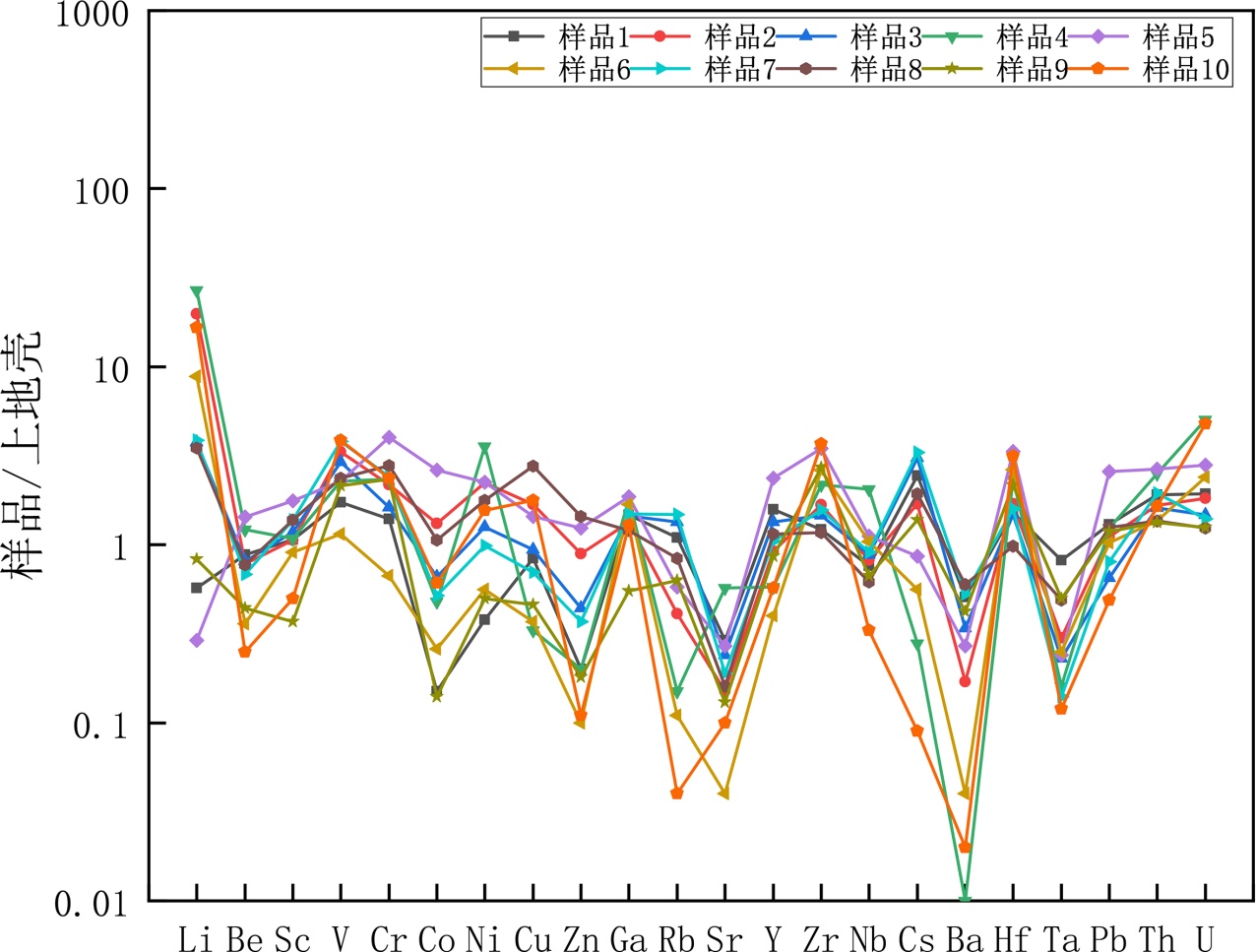 (2) 研究区本溪组含铝岩系中V、Cr、Ga、Zr、Hf、Th、U含量显著富集;Li、Cs、Sc、Ni、Y等元素相对富集,Sr、Ba、Ta显著亏损;Be、Co、Cu、Zn、Rb、Nb、Pb元素相对亏损。