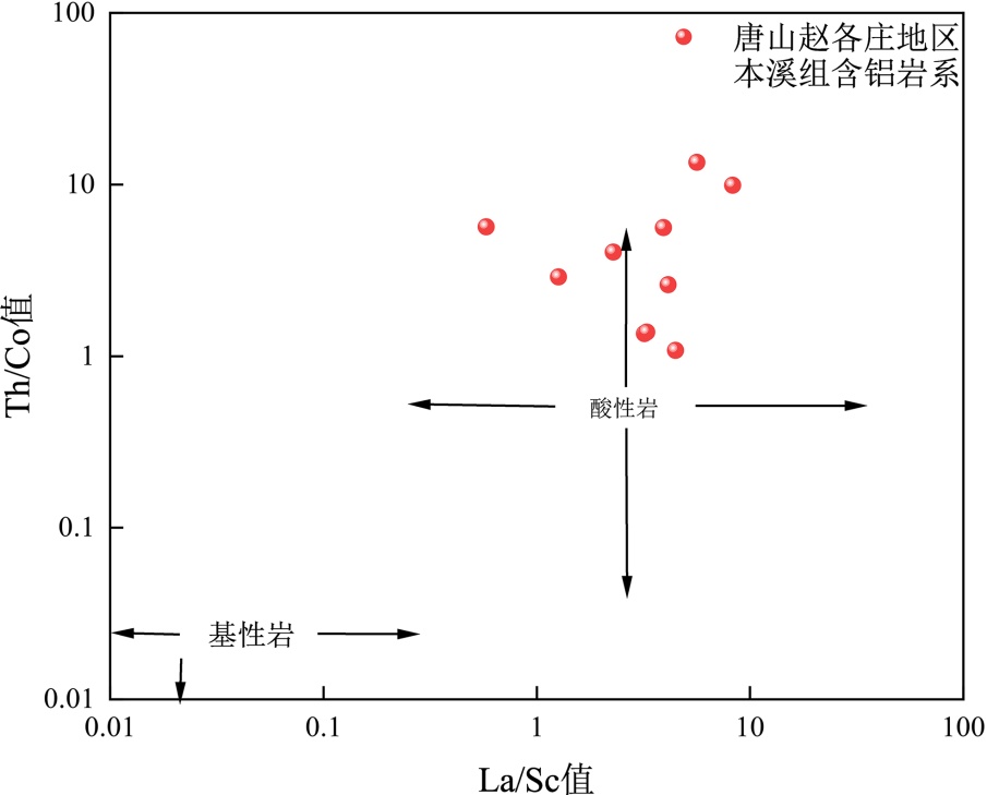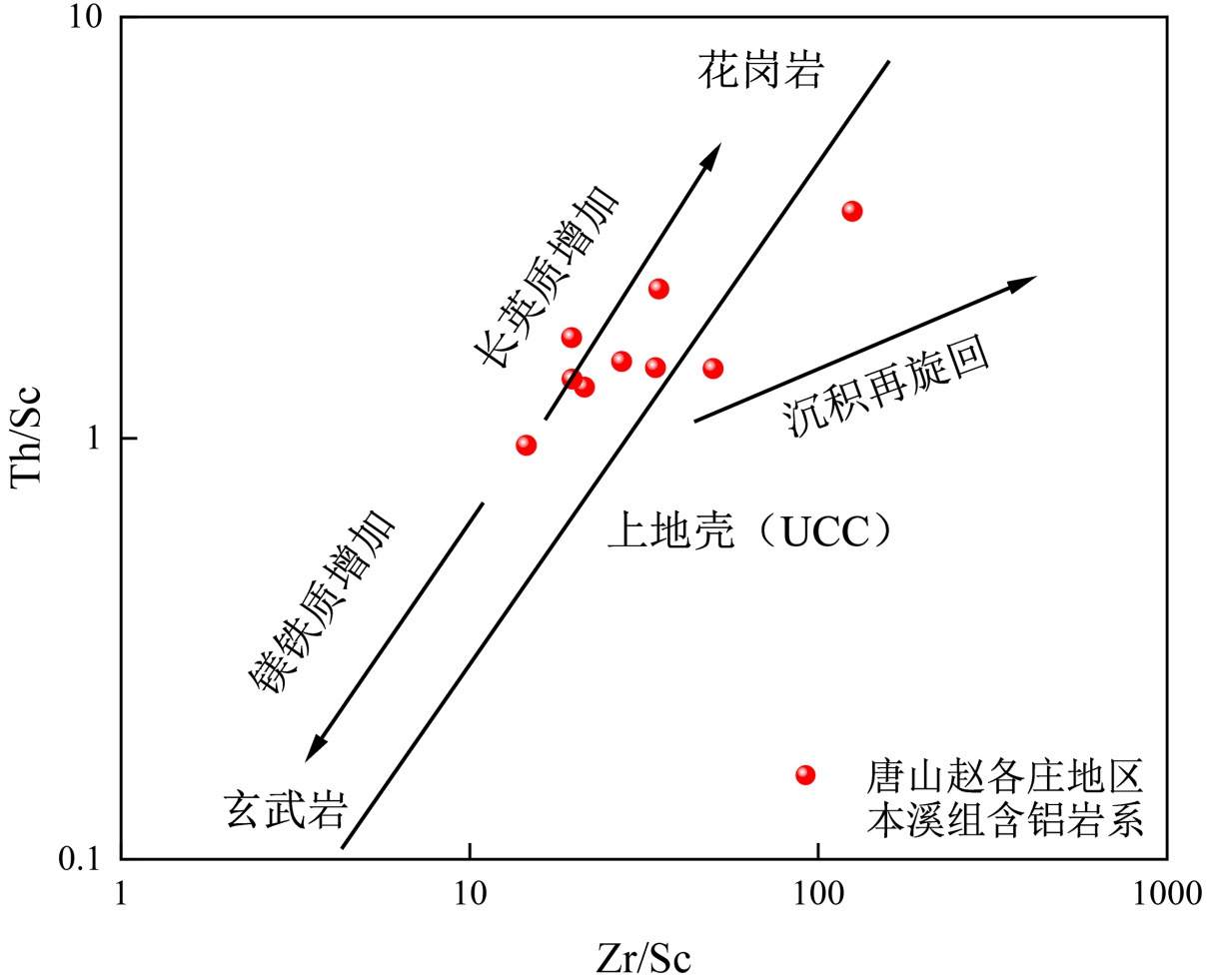 本文利用Zr/Sc-Th/Sc二元图解(图5)可以用来辨别冀东唐山赵各庄地区本溪组含铝岩系的成岩是因原岩风化控制还是多旋回改造作用致使的,这是利用Zr元素主要存在于稳定的重矿物锆石中,Th元素在酸性岩中富集而Sc元素在基性岩中分别富集的特点[16]。随着旋回沉积的进行,沉积物中的稳定重矿物锆石会不断富集,而在火成岩中则不会,从而使Zr/Sc增大而Th/Sc基本保持不变[17]。发现冀东唐山赵各庄地区本溪组含铝岩系主要受原岩成分控制而非沉积物质的多旋回改造作用导致的。