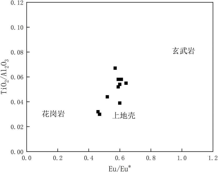 利用微量和稀土元素的物源判别图可以对沉积岩的物源类型进行更细致的划分。这是利用微量元素在不同岩石中的富集特征不同,根据这一点微量元素和稀土元素可为示踪沉积物母岩提供了重要依据。针对Eu异常其可以反应源区丰度[20] [21],上地壳Eu异常一般为0.66,玄武岩Eu异常一般为0.9~1.03。故利用Eu/Eu*-TiO2/Al2O3图解(图6(a))可以用来判断原岩信息,可以发现样品整体落于上地壳的上方,存在部分样品与花岗岩较为接近,对此认为其成矿物质来源上地壳沉积有关,并存在部分岩浆岩的影响。根据La/Sc-Th/Co图解(图6(b))可以发现冀东唐山赵各庄地区本溪组含铝岩系落于中性岩与酸性岩之间,可以得知成矿来源于中酸性岩石中。根据Th-Hf-Co三角图解(图6(c)),可知样品分布可以得知样品以长英质火山岩为主,并存在少量的石英岩与泥岩。根据(La/Yb)N-∑REE图解(图6(d)),可以发现绝大多数样品均落在花岗岩与沉积岩的区域,通过这一分配模式表明冀东赵各庄地区本溪组含铝岩系的物源区主要是由花岗岩与沉积岩组成的。长英质火山岩是岩浆岩的一种故冀东唐山赵各庄地区本溪组含铝岩系的物质来源于中酸性花岗岩。
