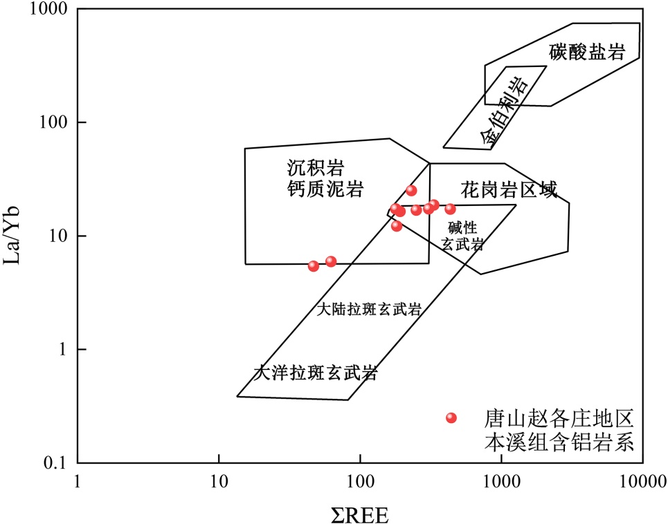3三角图解可知冀东唐山赵各庄地区本溪组含铝岩系主要是以高岭土化作用的铝土质高岭石为主。(3) 根据样品可知冀东唐山赵各庄地区稀土总量变化大,轻稀土较重稀土富集,重稀土呈现部分亏损。较为轻微的