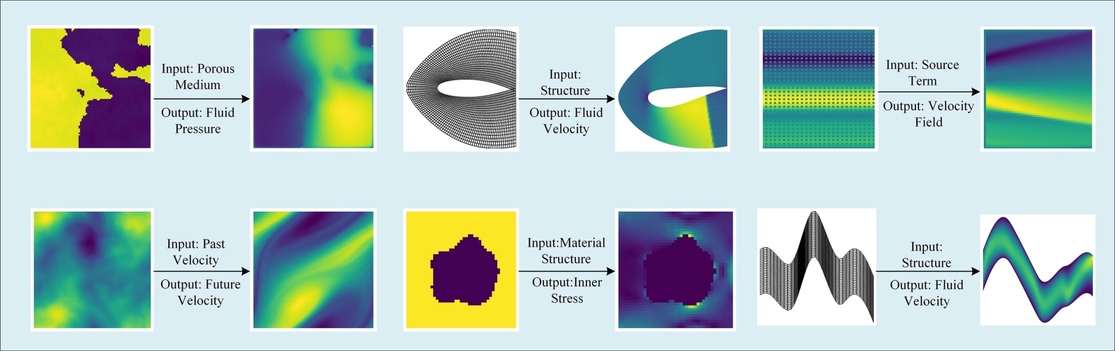 在科学与工程领域,从流体运动、热传导到输运与材料建模,广泛的前向问题均可表述为偏微分方程(PDE) [1]。其目标是:在给定初始或边界条件、系数或源项的情况下,计算满足连续域上控制定律的解场[2]。尽管成熟的数值求解器能提供可靠解,但现代工作流程往往需要在参数扫描、优化循环或实时决策流程中重复进行PDE求解,此时计算负担便成为主要瓶颈[3] [4]。