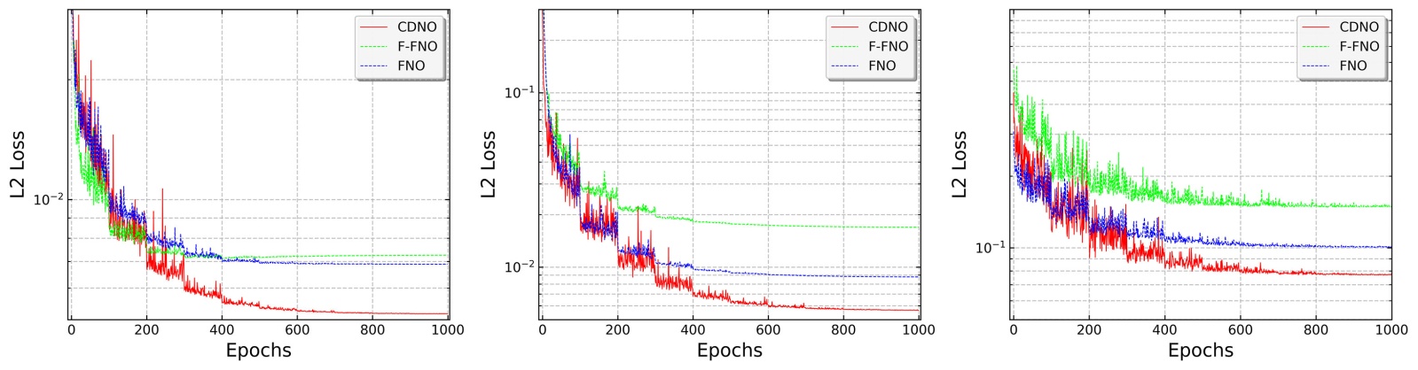 Figure 6. Learning curves for Darcy flow (left), Burgers’ equation (middle), and Navier-Stokes equations (right), where the horizontal axis denotes training epochs and the vertical axis represents the