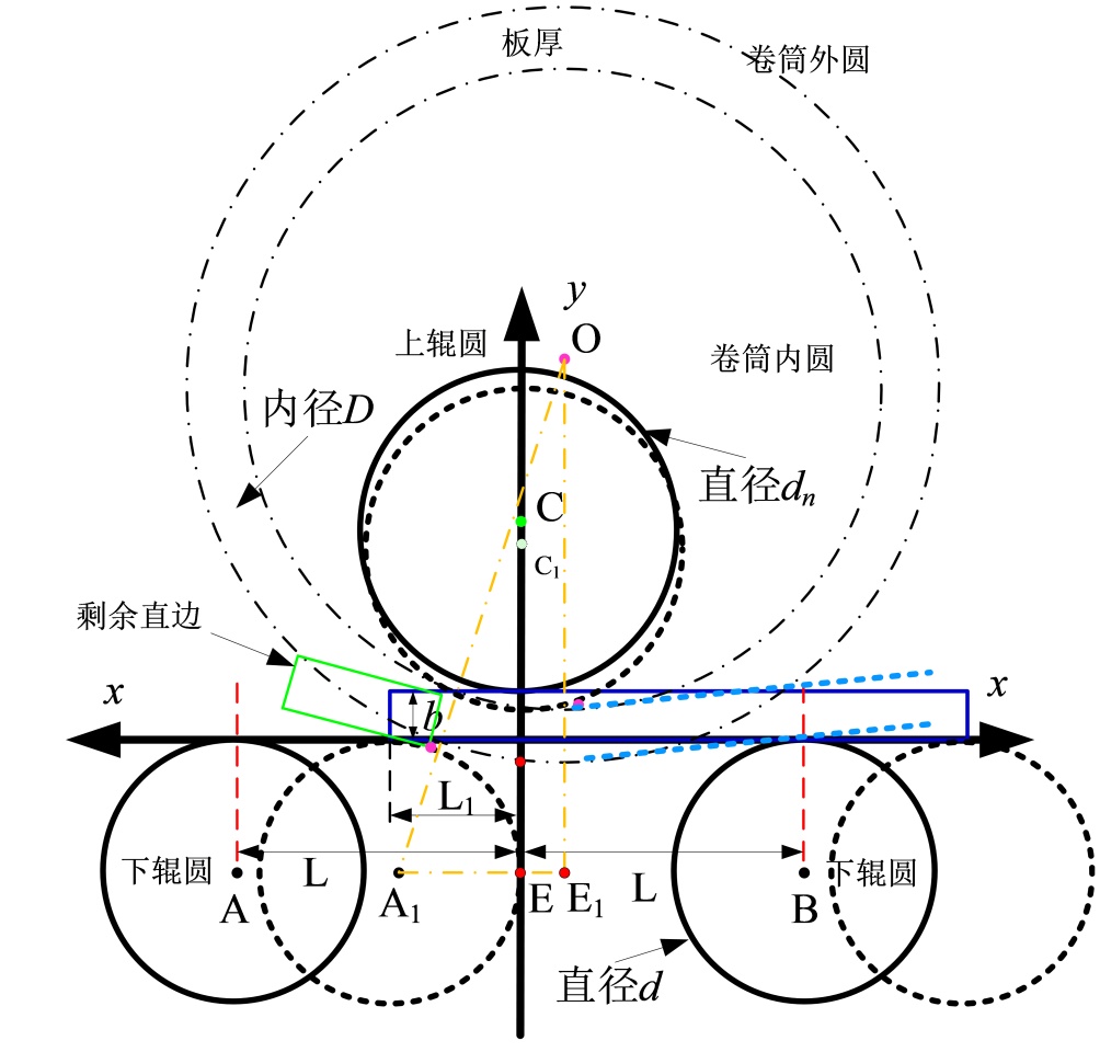 如图1所示,对称式三辊卷板机(下辊可调但中心距固定)在预弯时(坐标xy平面上),板材由下辊A、下辊B支撑,且夹上辊C与两下辊之间。首先,通过调整上辊与下辊的间距(其值为b),使板材固定于上、下辊之间且能够随上辊C的转动而平移;然后将下辊A移至A1,A1顶部与板材需要预弯的位置L1相切,L1为剩余直边,其值为板厚b的2~4倍;其次,根据推导的公式(1)将上辊C下移至C1,从而对板材进行预弯。同理,在预弯板材的另一边时,移动下辊B至板材另一端剩余直边所在位置,其余步骤一致。
