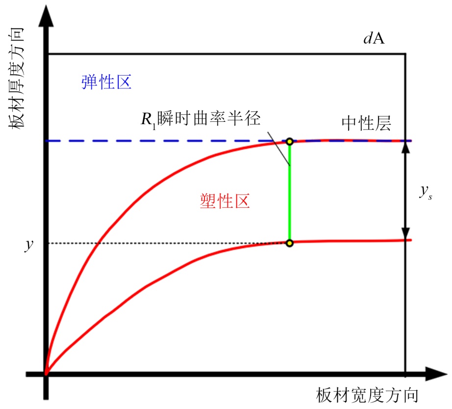 板材在弹性区域(距中性层距离ys ≤ y,ys为弹性区与塑性区的分界点距离),应力与应变满足胡克定律:σ = Eε = Ey/R1,其中:R1为预弯时的瞬时曲率半径。