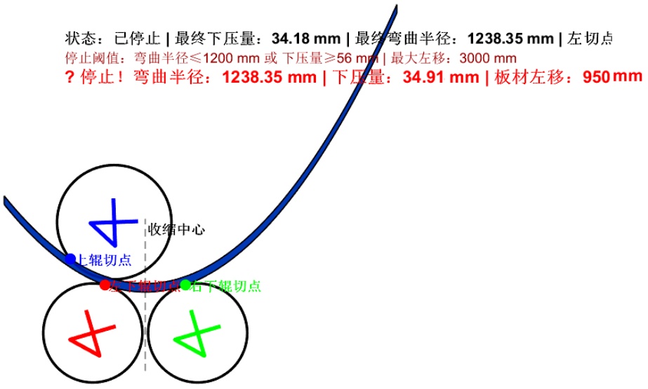 根据文献[13]并结合图1所示,在实际预弯过程中,由于辊系结构的限制,实际弯曲区域长度受上下辊直径的影响,其最大值为: