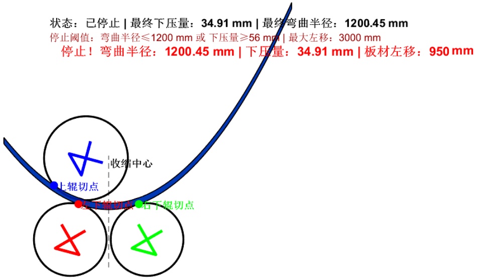 从图4(a)可以看出,采用正常预弯下压卷制方法,仿真板材停止弯曲时弯矩半径为1238.35 mm,相较于目标弯曲半径1200 mm存在38.35 mm的回弹量,预弯回弹偏差较为明显,这会直接导致卷制构件的成型精度不足,影响后续装配与使用性能。而图4(b)本文研究的预弯下压卷制方法,在相同的条件下,停止弯曲时的弯曲半径仅为1200.45 mm,与目标弯曲半径的差值仅为0.45 mm,回弹量较常规方法降低了约98.8%,成型精度得到了大幅提升。这一结果充分表明,本文研究的预弯下压卷制方法通过优化预弯下压策略,有效抑制了板材弯曲后的弹性回复行为,显著改善了回弹控制效果,解决了常规方法回弹量大、成型精度难以保障的问题,验证了本文提出的三辊卷板机预弯下压卷制方法的可行性。