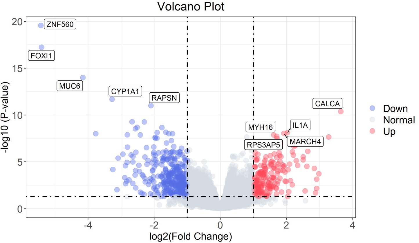 具体而言,显著上调的基因,如CALCA、IL1A等,在肿瘤组织中表现出较高的表达水平,提示其可能在肺癌的发生和发展过程中起到重要作用。相反,显著下调的基因,如ZNF560、FOXI1等,在肿瘤样本中的表达量较低,表明它们可能具有抑制肿瘤的作用。