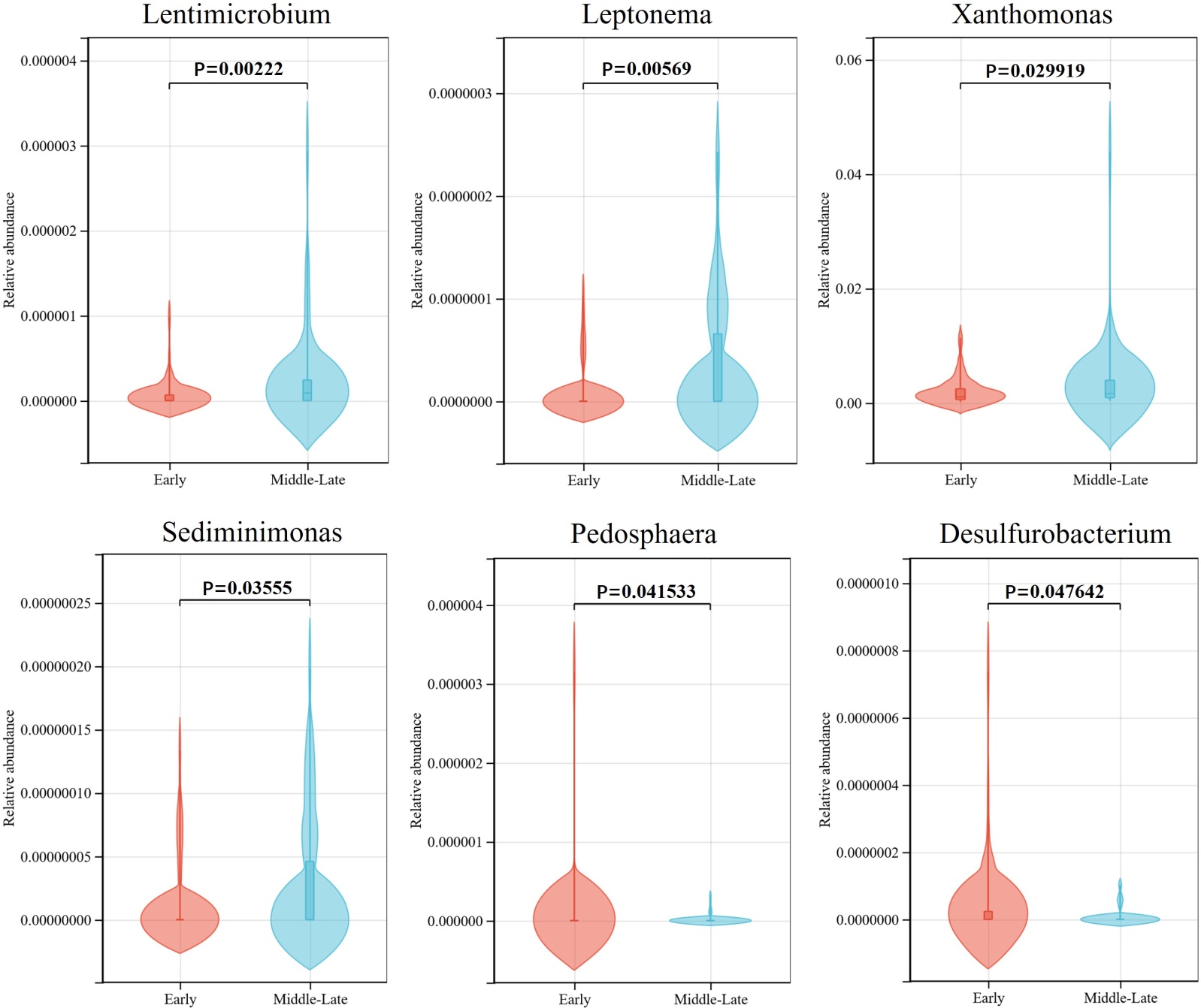 本研究采用Mann-Whitney U检验,比较早期与中晚期肺癌患者间微生物相对丰度的分布差异,以筛选显著差异富集的微生物物种作为候选生物标志物。