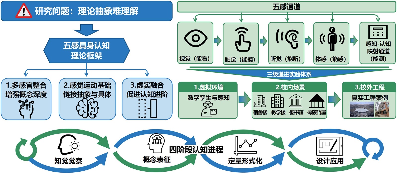 本研究的核心目标是:构建系统的“五感具身认知”实验教学框架,通过“虚拟环境强感知→真实场景增体验”的认知进阶路径,破解建筑物理“理论难理解”的教学困境。