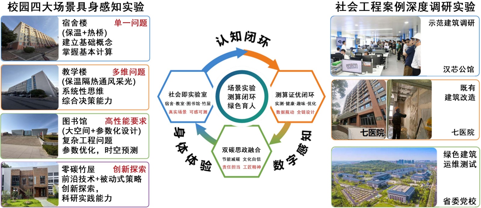 第四,实践创新。将校园建筑转化为“活的实验室”,构建宿舍楼、教学楼、图书馆、零碳竹屋四大递进式实验场景。