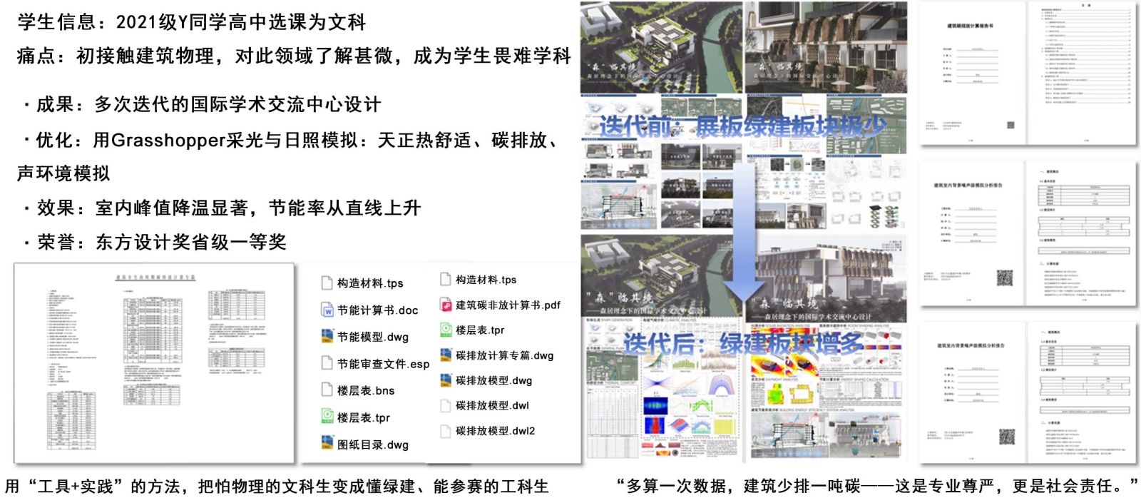 开放式问卷和深度访谈显示,学生对五感具身认知教学法的主观评价高度积极。学生反馈最有价值的学习体验包括以下几个方面:第一,通过红外成像理解抽象公式。第二,在真实环境中体验热工性能问题。第三,通过虚拟实验建立测量预期。第四,通过工程项目调研增强应用信心。学习方式发生显著转变,从“背公式应付考试”转向“真的想搞懂”,从被动接受转向主动观察思考,热工概念开始自动融入设计思维。如文科生喻振宇(21级)从首次热阻计算仅得48分,通过红外热像仪实测教学楼漏热问题的震撼体验和数智工具辅助学习,最终对遮阳设计进行12轮参数化迭代优化,将节能率从35%提升至68%,作品获全国绿色建筑设计竞赛银奖并推免至华中科技大学(图4)。