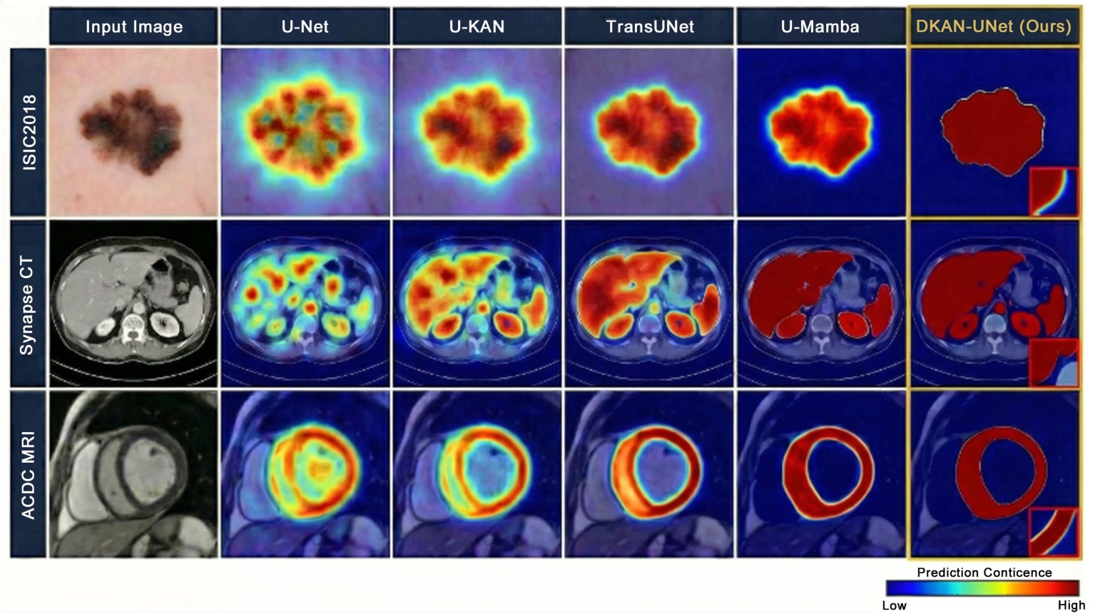 全面的实验验证:在多个公开医学图像分割数据集上进行广泛实验,验证DKAN-UNet在分割精度、计算效率和可解释性方面的优越性,并与现有SOTA方法进行了详细对比。