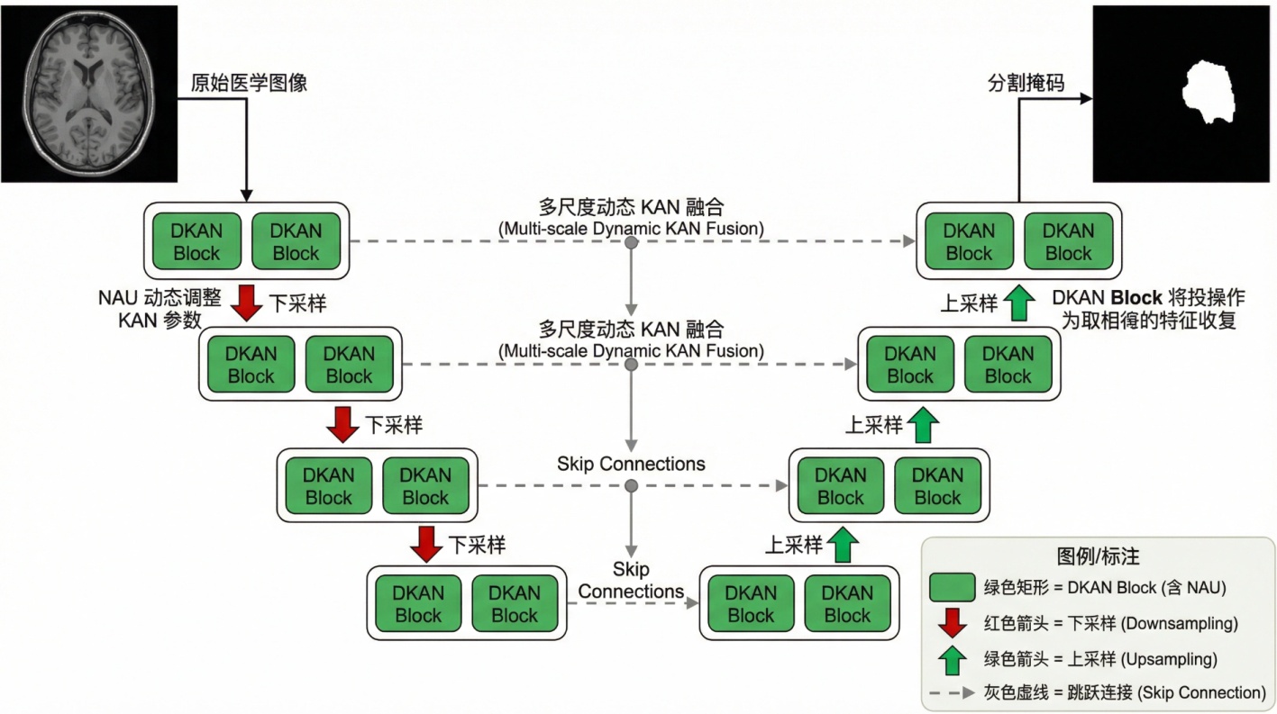 提出多尺度动态KAN融合策略:在U-Net的编码器和解码器中部署DKAN Block,并通过跳跃连接实现多尺度特征的自适应非线性交互,确保在不同分辨率下都能进行高效且自适应的特征处理。
