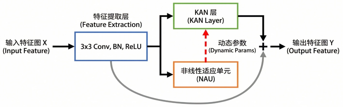 首先通过特征提取层,然后并行送入非线性适应单元(NAU)和KAN层。NAU根据输入特征生成动态参数,用于配置KAN层中的B-spline激活函数,最终输出经过自适应非线性变换后的特征图