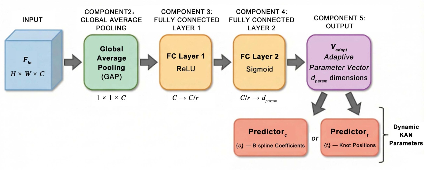 ,首先通过全局平均池化(GAP)将其压缩为特征向量,然后经过两个全连接(FC)层进行变换,最终生成用于预测KAN激活函数参数的控制向量